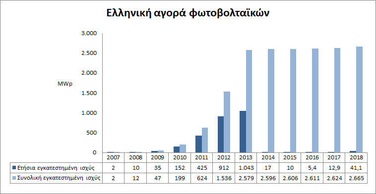 Στα τέλη του 2018 στην Ελλάδα ήταν εγκατεστημένα 2.665 μεγαβάτ (MWp) φωτοβολταϊκών, εκ των οποίων τα 2.106 MWp επί εδάφους και τα υπόλοιπα σε στέγες κτιρίων.