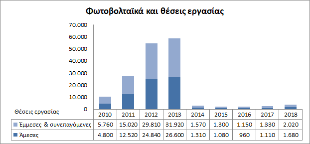Το 2018, η αγορά φωτοβολταϊκών συντήρησε 3.700 ισοδύναμες θέσεις πλήρους απασχόλησης (άμεσες, έμμεσες και συνεπαγόμενες).