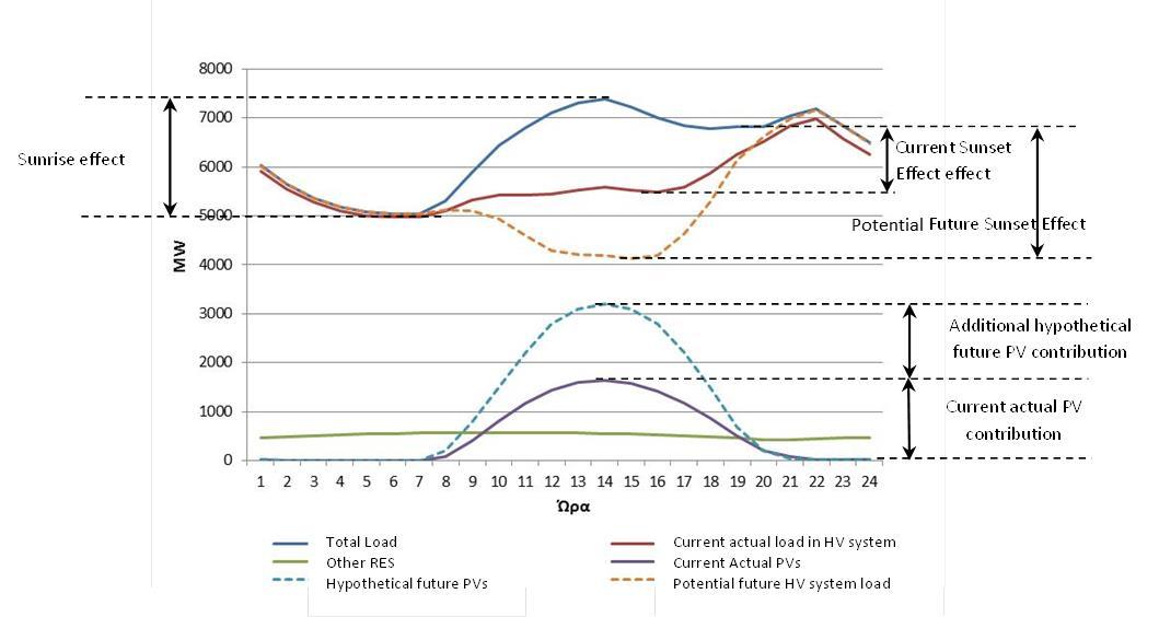 Παρουσιάζοντας μάλιστα ανάλυση από τα ωριαία στοιχεία παραγωγής του 2015, όπου δεν υπάρχουν ως σήμερα ουσιαστικές μεταβολές στα Φ/Β αλλά ούτε και στην ζήτηση ενέργειας οπότε η εικόνα παραμένει εν πολλοίς ίδια, ο Πρόεδρος του ΣΠΕΦ τόνισε πως στην ελληνική αγορά το ευεργετικό Sunrise Effect υπερακοντίζει σημαντικά το πολυειπωμένο Sunset. Δηλαδή η άνοδος που γλυτώνει το σύστημα κατά την ένταξη των Φ/Β το πρωί και μέχρι την μεσημεριανή αιχμή ζήτησης, είναι μεγαλύτερη από την άνοδο με την οποία επιφορτίζεται το απόγευμα το σύστημα επειδή δύει ο ήλιος και τα Φ/Β αποσύρονται. Για να πλησιάσει να ανατραπεί η σημερινή ευεργετική κατάσταση και να παρουσιαστούν στην χώρα μας φαινόμενα τύπου Καλιφόρνιας, με στάσιμη την ζήτηση και το προφίλ της θα χρειάζονταν επιπλέον τουλάχιστον 1 GW νέων Φ/Β εγκαταστάσεων (βλ. διάγραμμα).