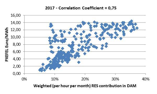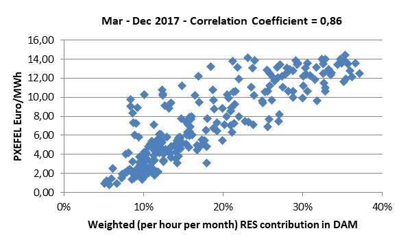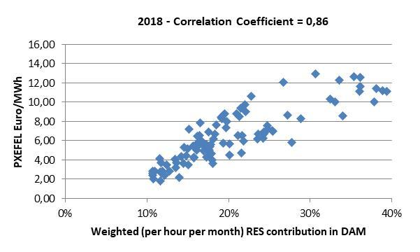 Αξίζει μάλιστα να σημειωθεί πως η στατιστική συσχέτιση (Correlation analysis) της υπολογιζόμενης κάθε ώρα ΠΧΕΦΕΛ, δηλαδή της μείωσης της χονδρεμπορικής τιμής του ρεύματος που απολάμβαναν λόγω ΑΠΕ προ του ν. 4414 οι Προμηθευτές, με την ενεργό ωριαία διείσδυση των ΑΠΕ (μεσοσταθμκή ανά ώρα του 24ώρου για κάθε μήνα ήτοι συνολικό πλήθος σημείων 12×24=288 ανά έτος) για την κάλυψη της ζήτησης, παρουσιάζει ιδιαίτερα υψηλό συντελεστή συσχέτισης (Correlation Coefficient) 75% το έτος 2017 και 86% το 2018 έως σήμερα.