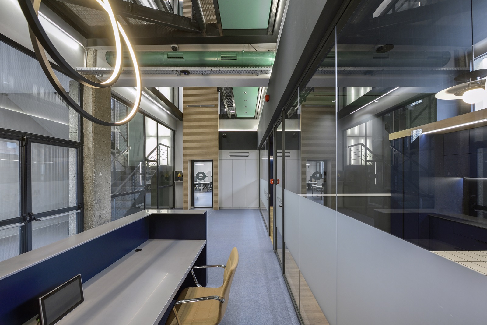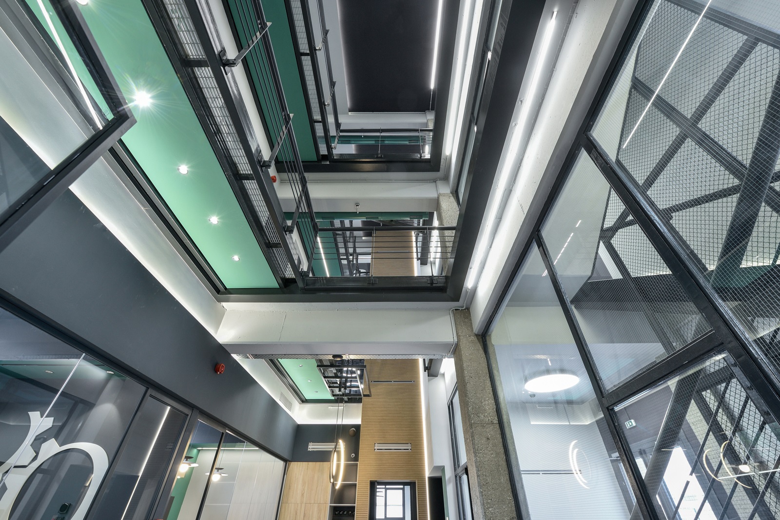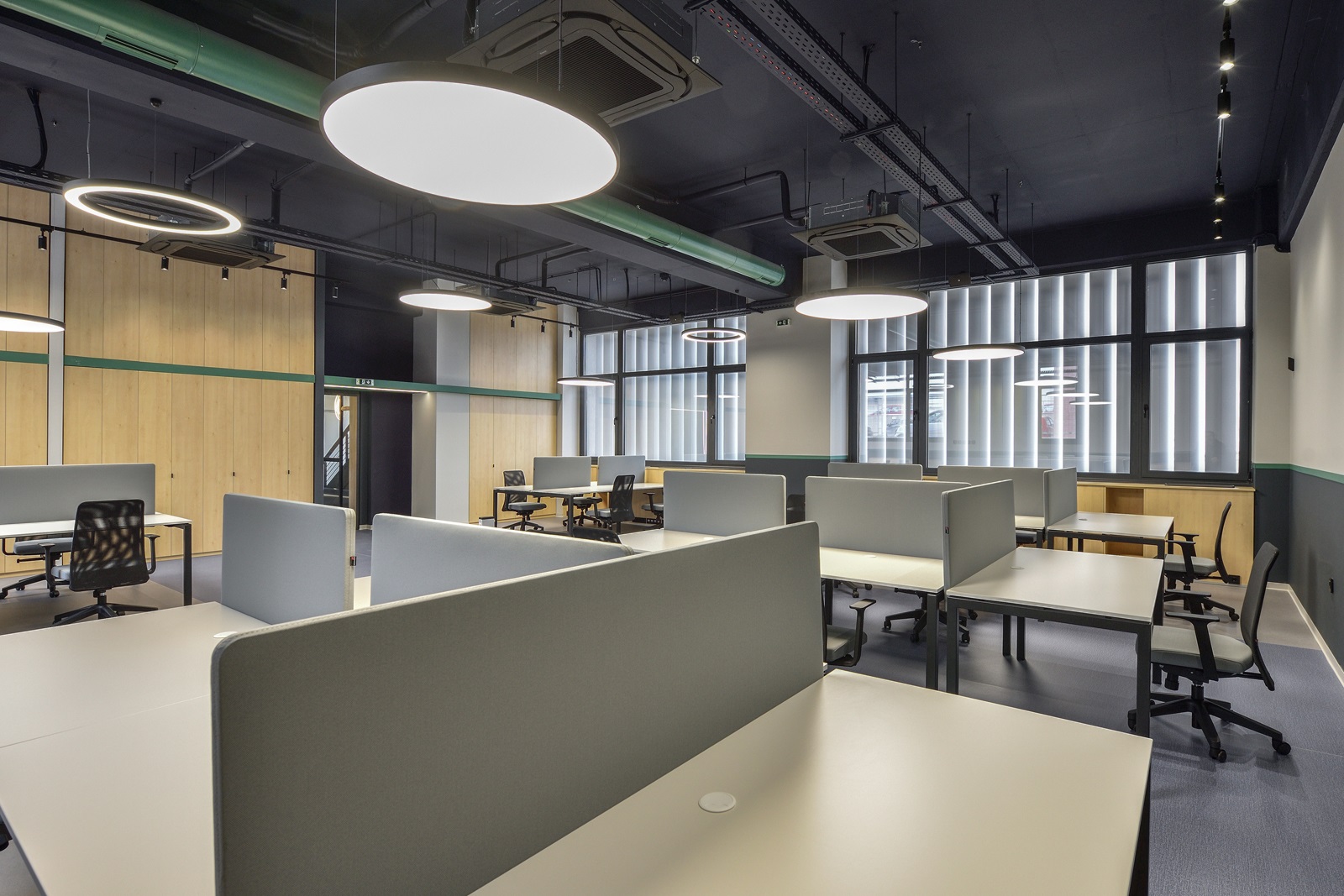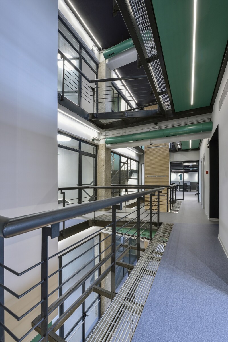 Οι οροφές των γραφείων παρέμειναν εμφανείς, ώστε, αφενός να μη χαμηλώσει το ελεύθερο ύψος των χώρων και αφετέρου, να γίνει ευκολότερη η πρόσβαση, συντήρηση και προσαρμογή των δικτύων σε μελλοντικές αναδιατάξεις των θέσεων εργασίας. Οι οροφές και τα δίκτυα που βρίσκονται κάτω από αυτές, χρωματίστηκαν σε σκούρα απόχρωση, ώστε να αποτελούν ένα σκοτεινό φόντο για τα φωτεινά κυκλικά και γραμμικά φωτιστικά των γραφείων.
