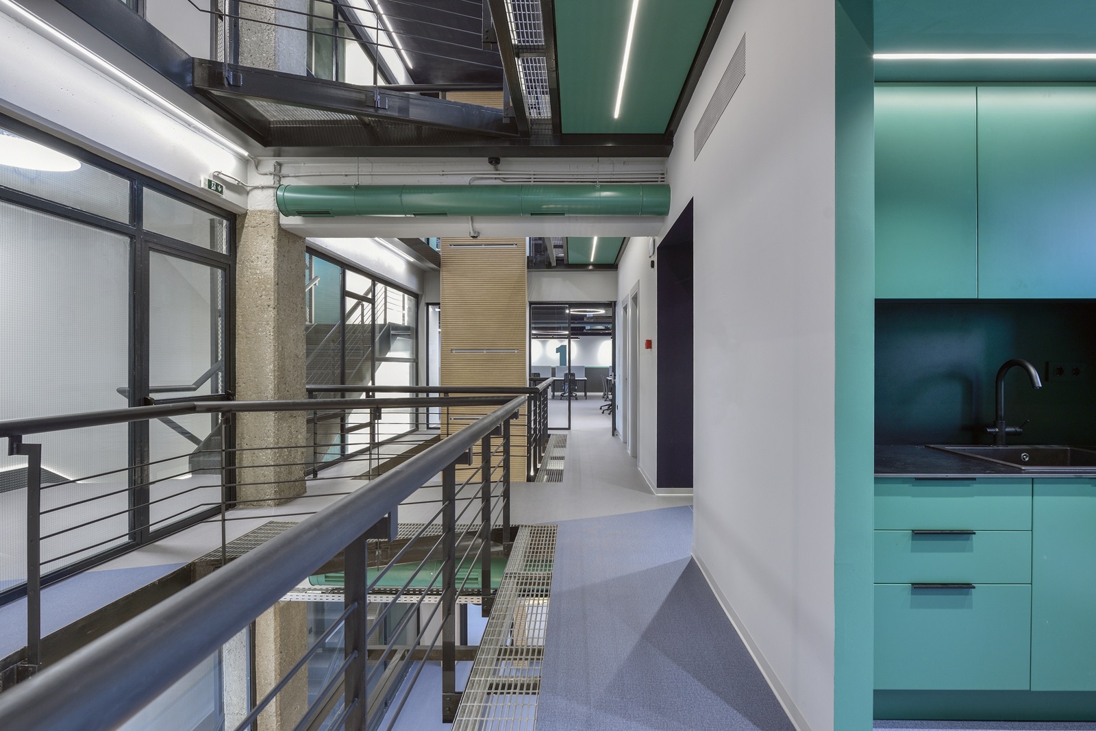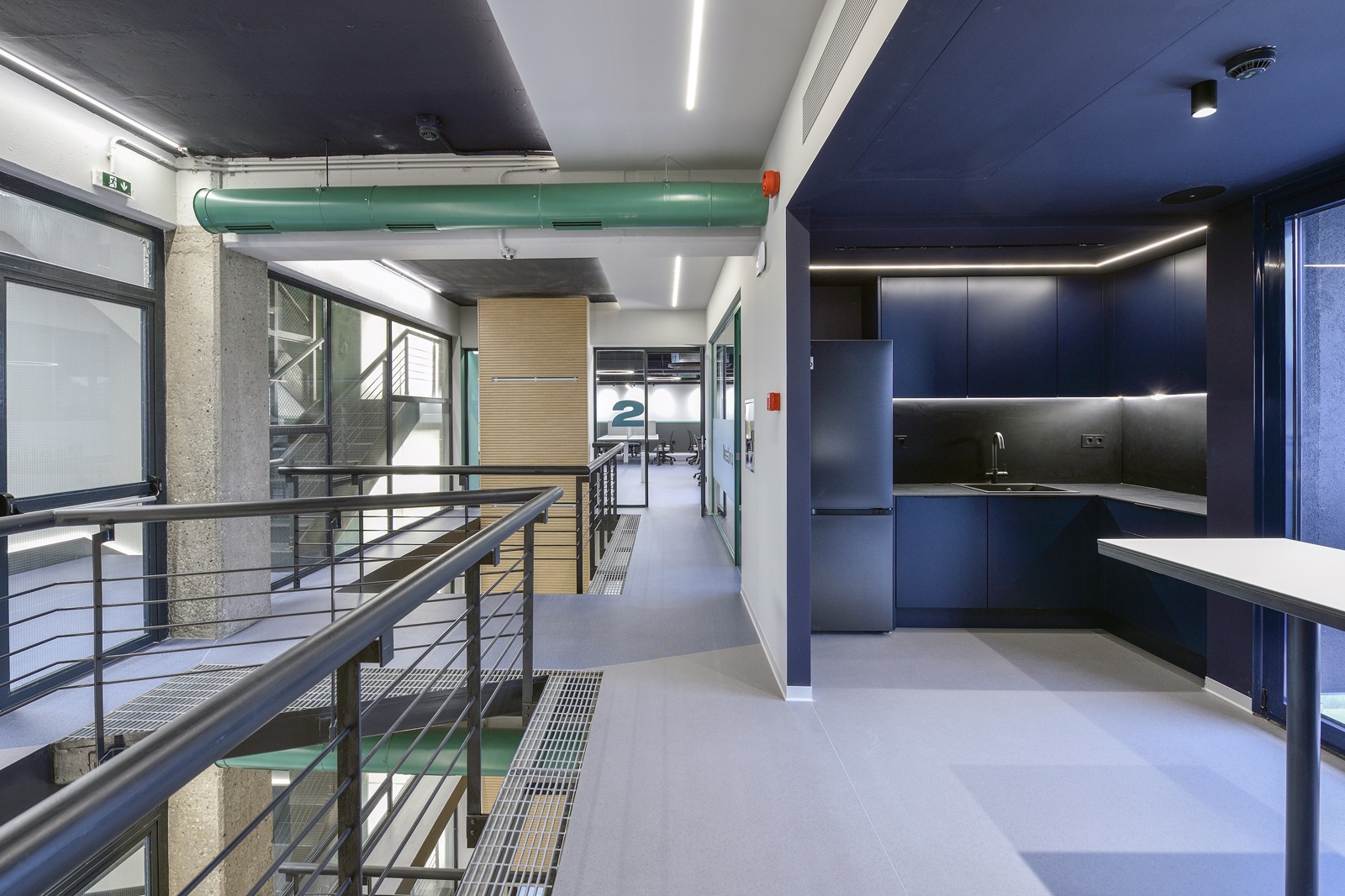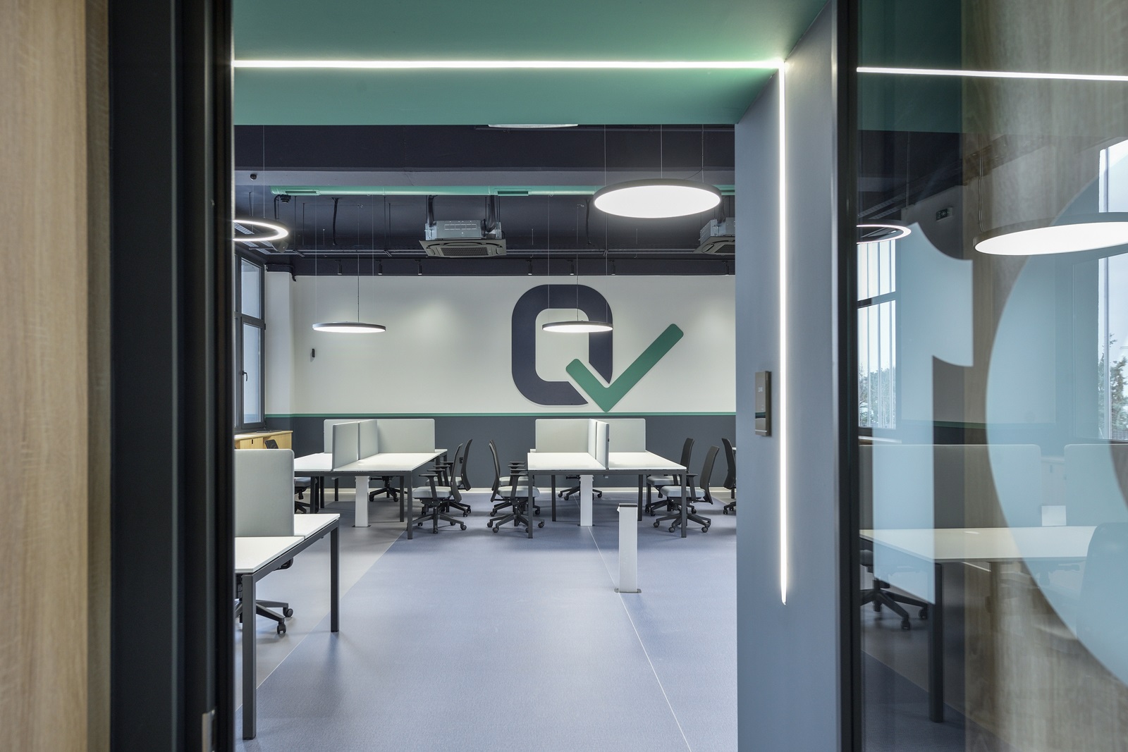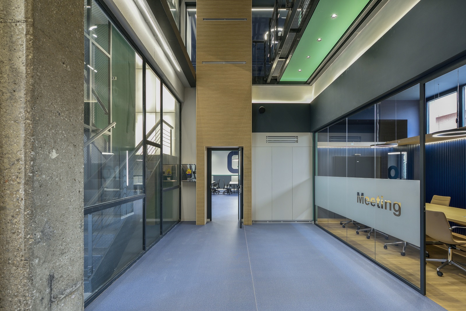 Οι οροφές των γραφείων παρέμειναν εμφανείς, ώστε, αφενός να μη χαμηλώσει το ελεύθερο ύψος των χώρων και αφετέρου, να γίνει ευκολότερη η πρόσβαση, συντήρηση και προσαρμογή των δικτύων σε μελλοντικές αναδιατάξεις των θέσεων εργασίας. Οι οροφές και τα δίκτυα που βρίσκονται κάτω από αυτές, χρωματίστηκαν σε σκούρα απόχρωση, ώστε να αποτελούν ένα σκοτεινό φόντο για τα φωτεινά κυκλικά και γραμμικά φωτιστικά των γραφείων.