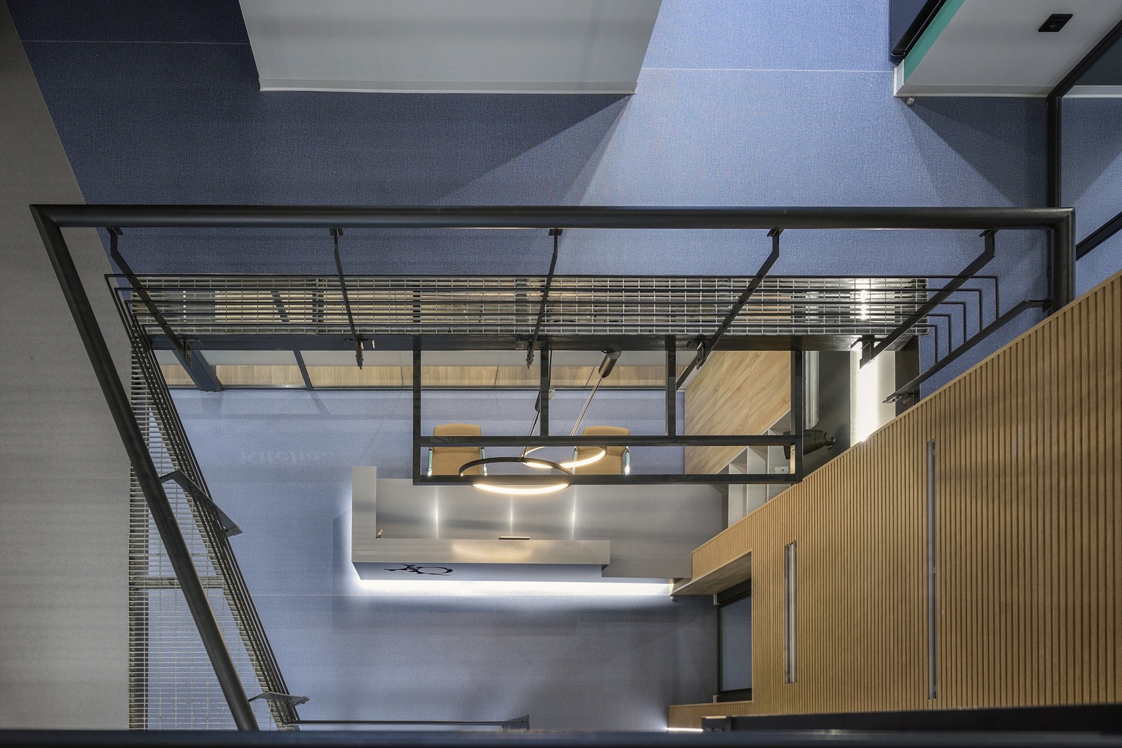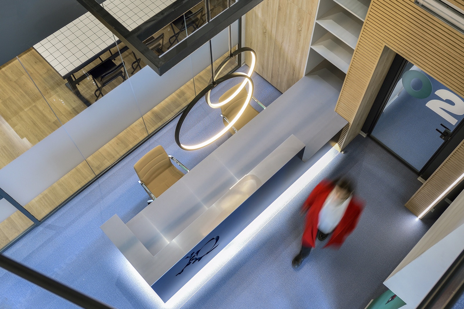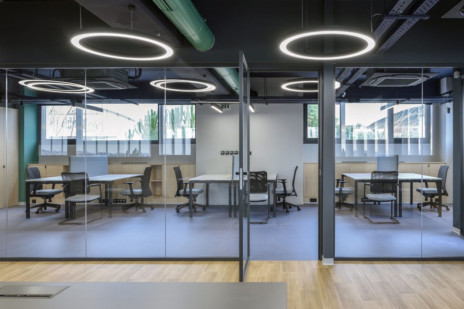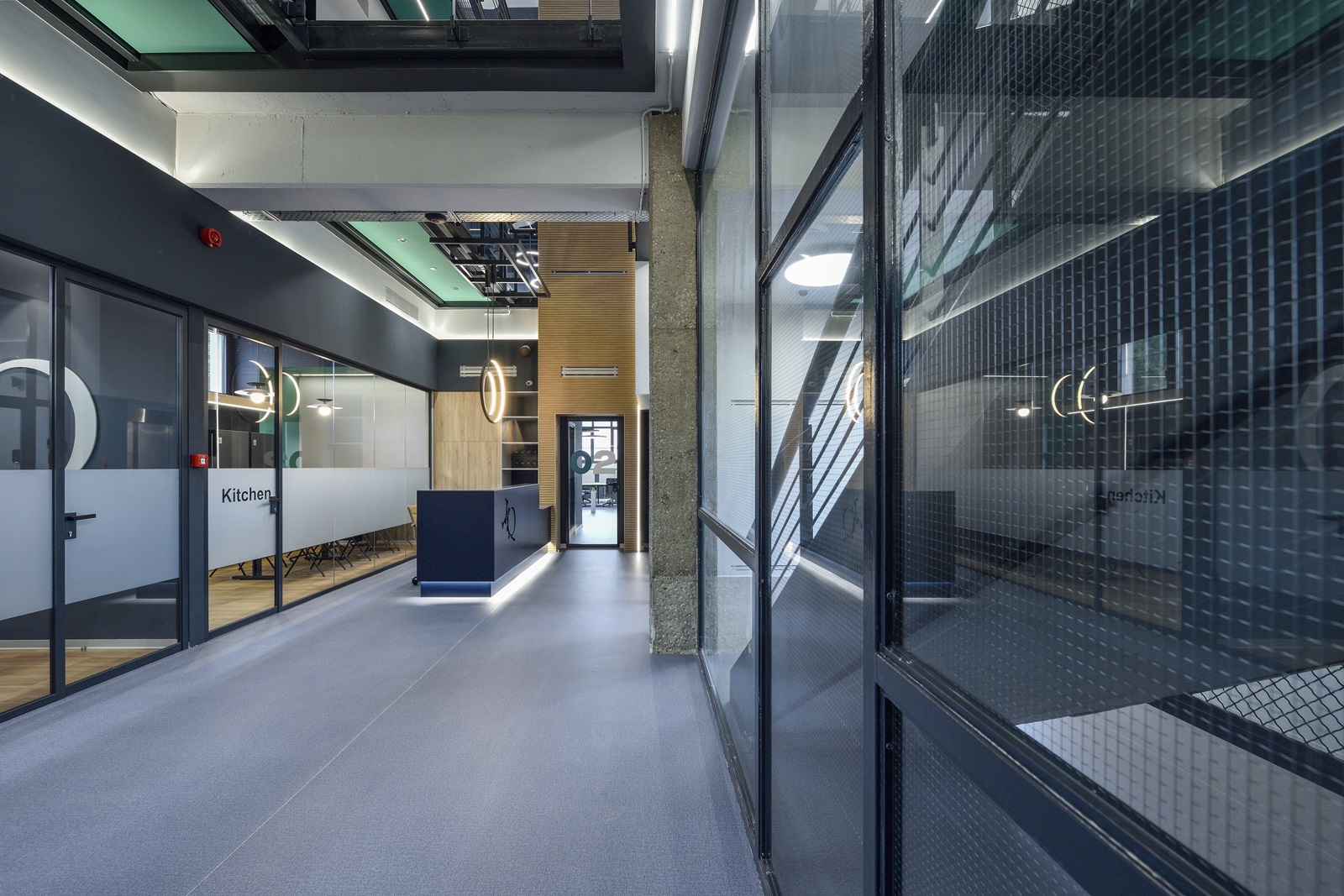 Οι οροφές των γραφείων παρέμειναν εμφανείς, ώστε, αφενός να μη χαμηλώσει το ελεύθερο ύψος των χώρων και αφετέρου, να γίνει ευκολότερη η πρόσβαση, συντήρηση και προσαρμογή των δικτύων σε μελλοντικές αναδιατάξεις των θέσεων εργασίας. Οι οροφές και τα δίκτυα που βρίσκονται κάτω από αυτές, χρωματίστηκαν σε σκούρα απόχρωση, ώστε να αποτελούν ένα σκοτεινό φόντο για τα φωτεινά κυκλικά και γραμμικά φωτιστικά των γραφείων.