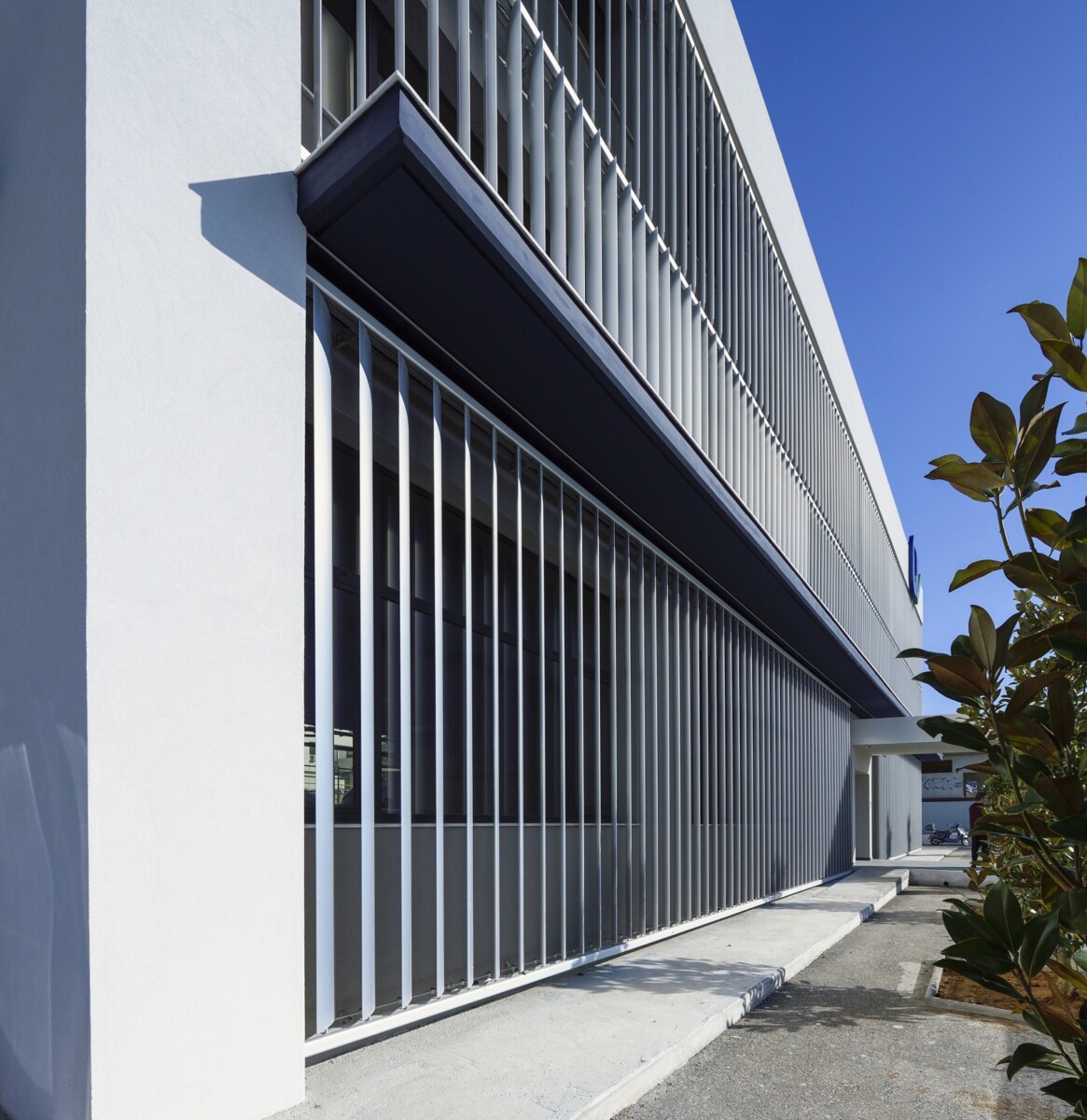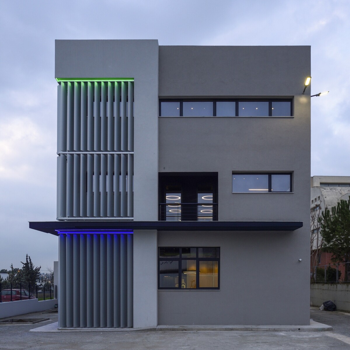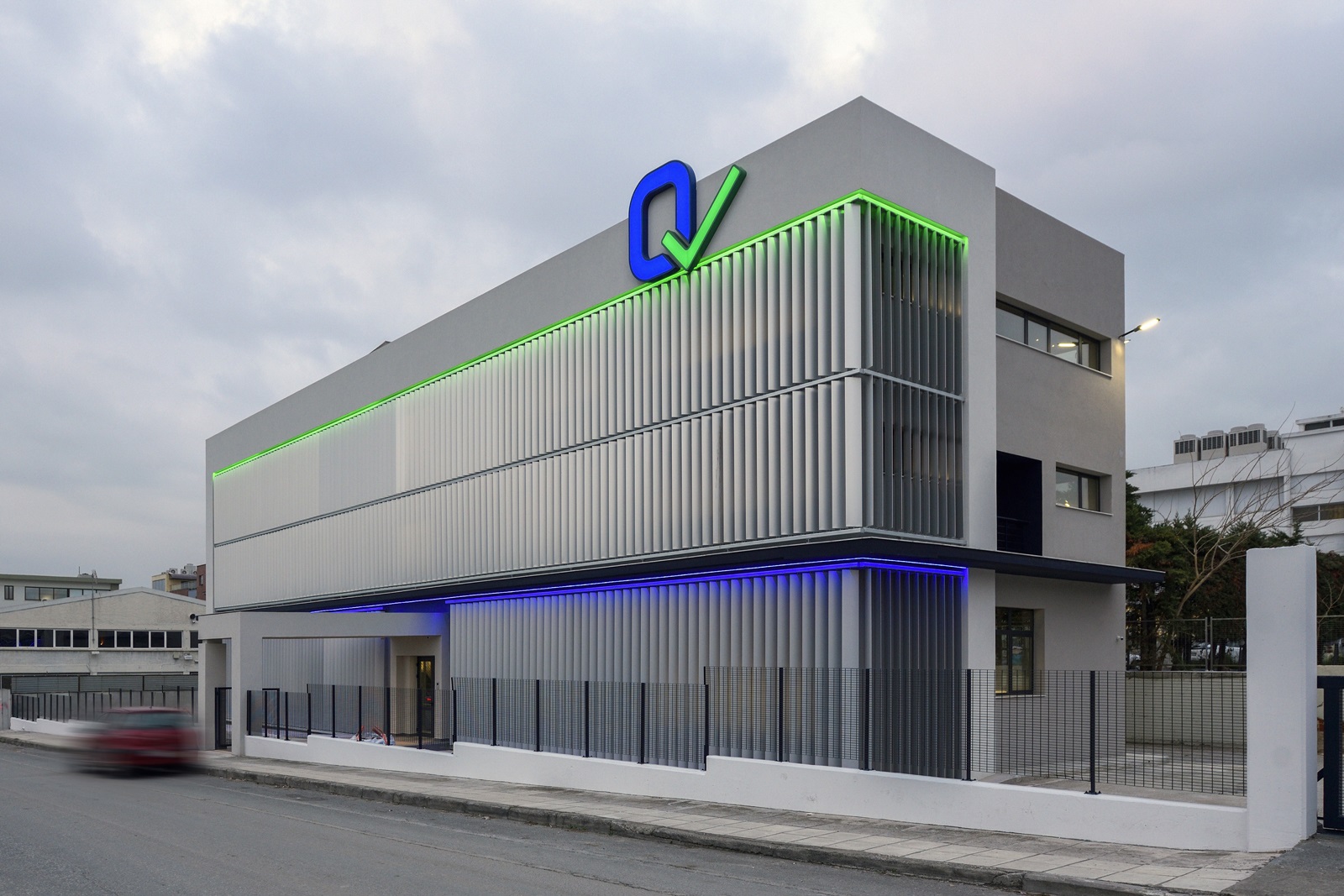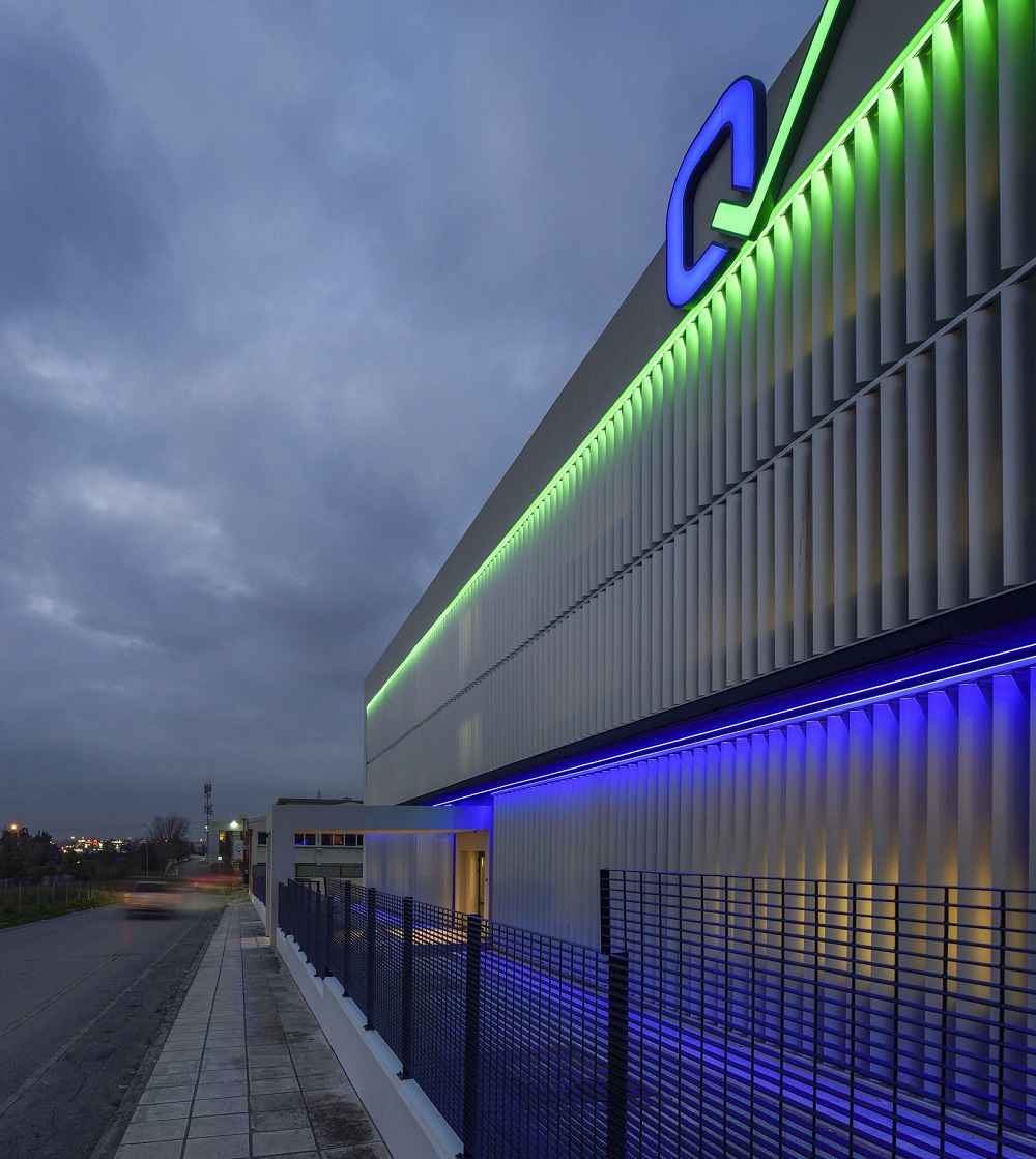 Για να “ζωντανέψει” η κύρια όψη και να δημιουργηθεί μία διαφορετική νυχτερινή άποψη του κτιρίου, φωτίστηκαν τα σκίαστρα με γραμμικούς φωτισμούς led στα δύο χρώματα του λογότυπου, με το πράσινο να φωτίζει τη διώροφη ζώνη ψηλά, και το μπλε χρώμα, τη ζώνη του ισογείου-βάση του κτιρίου.