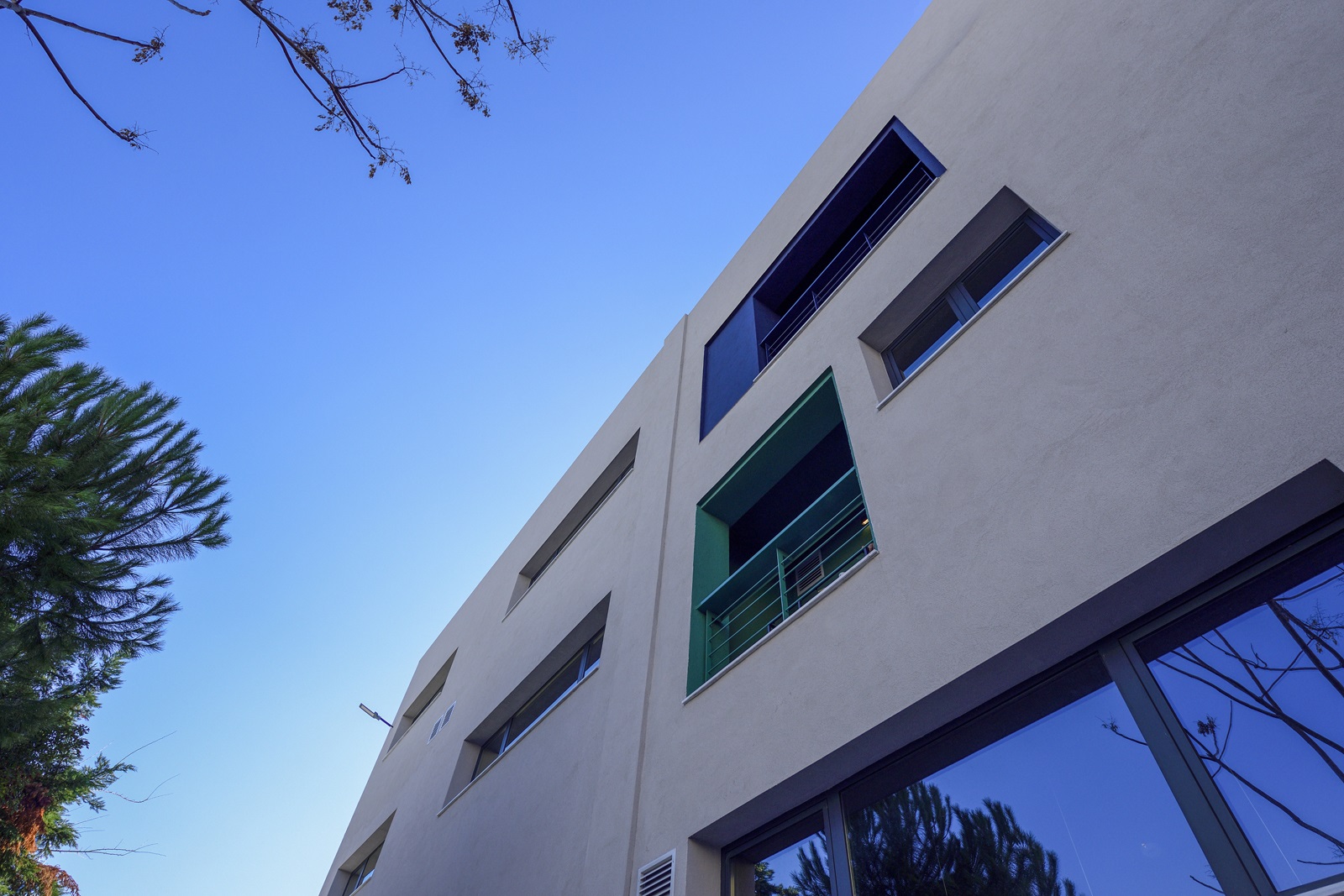 Οι όψεις επανασχεδιάσθηκαν, με νέα ανοίγματα-παράθυρα, σε νέες θέσεις και διαστάσεις. Στις α’ και β’ στάθμες, στις θέσεις των coffeespots και στη νότια όψη, σε συνέχεια των γραφείων της διεύθυνσης, διαμορφώθηκαν μικροί ημιϋπαίθριοι χώροι/διέξοδοι χαλάρωσης και χώροι για τους καπνιστές. Οι χώροι αυτοί, κατά τα άλλα “διασκεδάζουν” την ανατολική και νότια όψη του κτιρίου, χρωματισμένοι στις έντονες μπλε και πράσινες αποχρώσεις, αντίστοιχες των εσωτερικών χώρων.