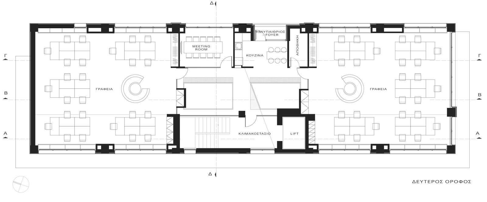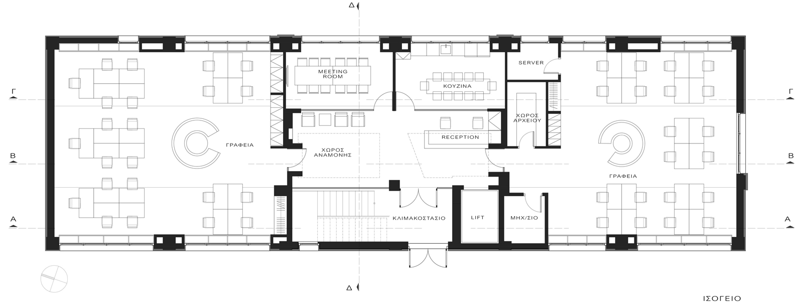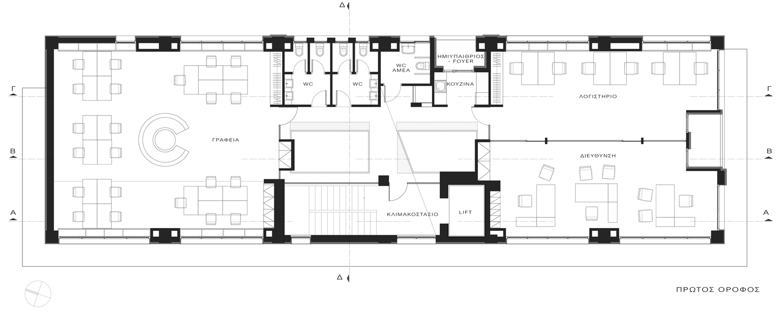 Τα γραφεία οργανώθηκαν στα αριστερά και δεξιά του εσωτερικού αιθρίου, σε όλες τις στάθμες. Κεντρικά, στο ισόγειο διαμορφώθηκαν οι “δημόσιοι” χώροι του κτιρίου: η reception, ένας μικρός χώρος αναμονής και διαχωρισμένοι με ένα μεγάλο υαλοστάσιο, ένας χώρος συνεργασίας (meeting room) και μία κουζίνα-χώρος πρόχειρου φαγητού. Στην α’ στάθμη χωροθετούνται οι χώροι υγιεινής και ένα coffeespot για την παρασκευή καφέ, προμήθεια νερού κλπ. Στη β’ στάθμη υπάρχει ένα δεύτερο coffeespot και ένας δεύτερος χώρος συνεργασίας (meeting room).