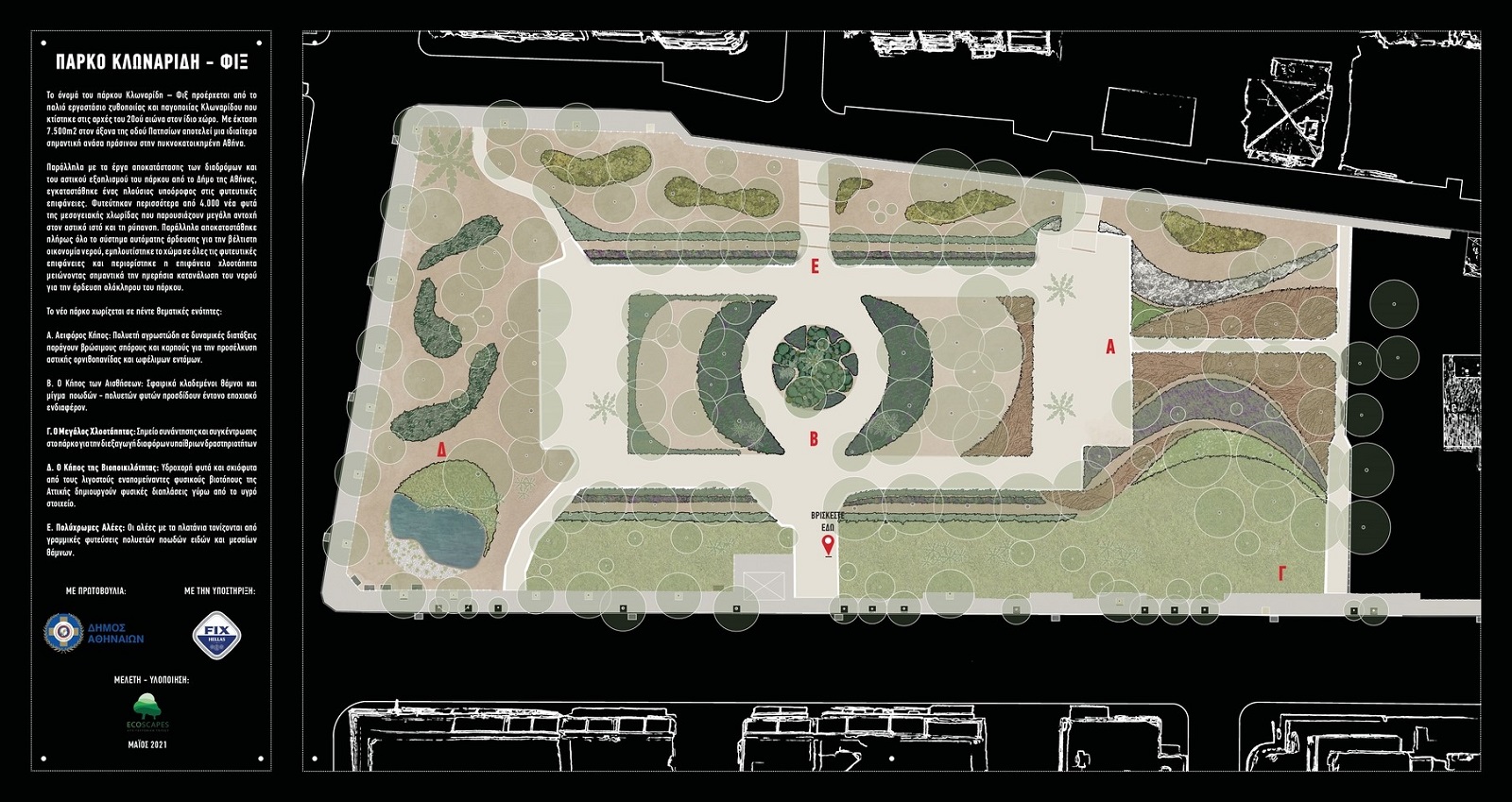 Το πάρκο Κλωναρίδη – Φιξ «ξανασυστήνεται» υπό τη νέα του, ριζικώς ανανεωμένη μορφή, ως σύγχρονο αειφόρο αστικό πάρκο, με δομή και φύτευση βάσει των διεθνών τάσεων αρχιτεκτονικής τοπίου και περιβαλλοντικού σχεδιασμού.