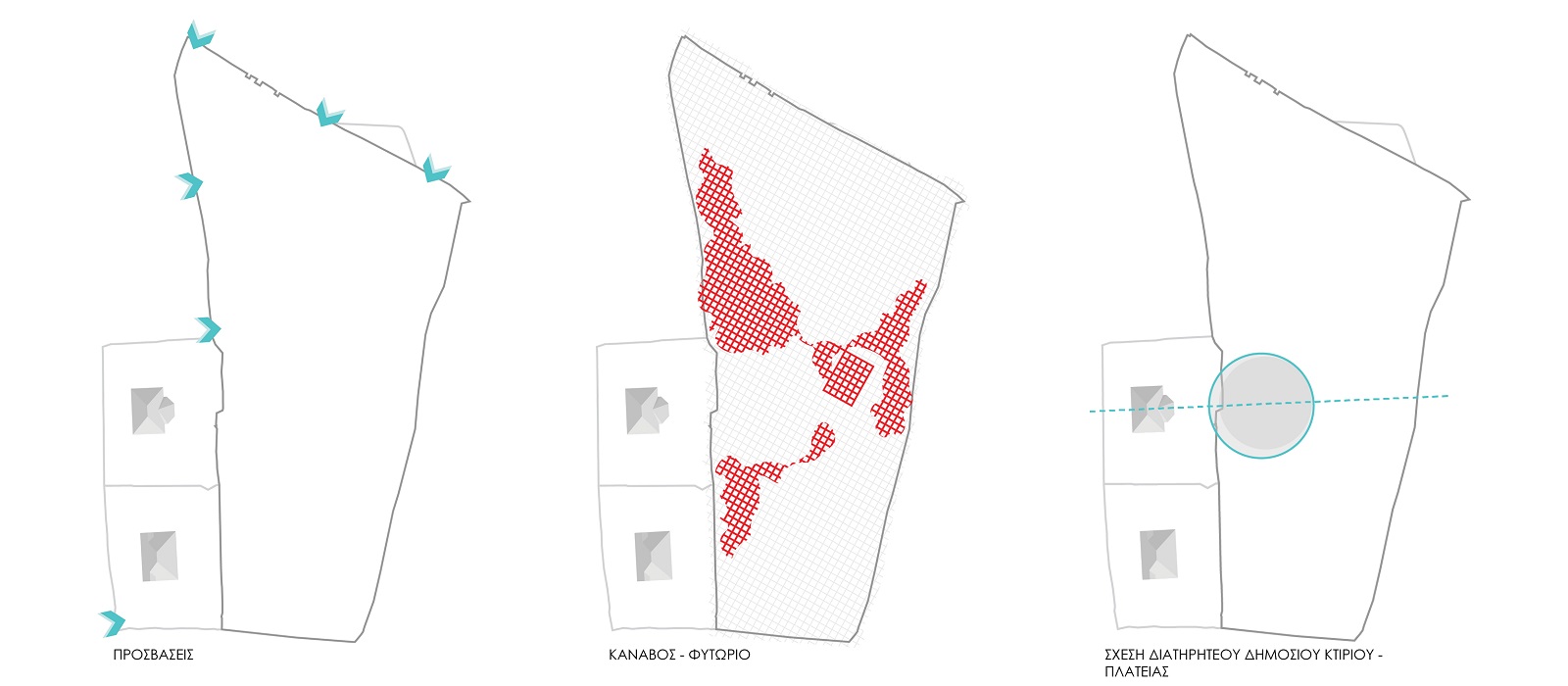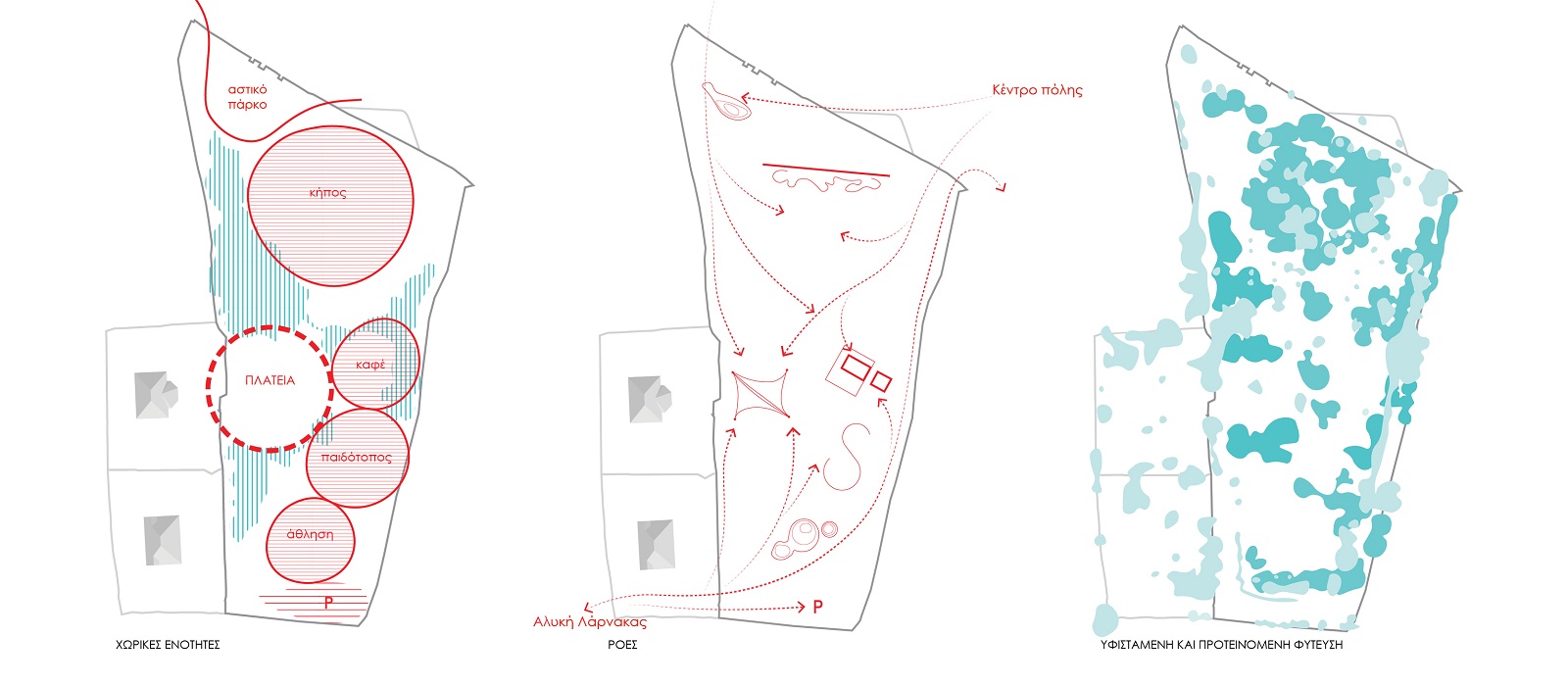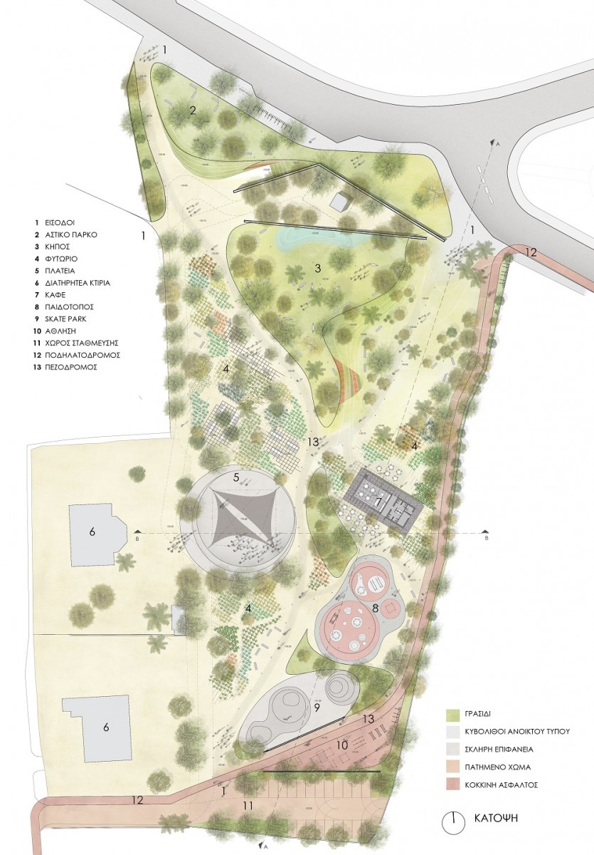 1. Αστικό Πάρκο: Χωροθετείται στο ψηλό σημείο του τεμαχίου και αφορά την αλληλεπίδραση του πάρκου με την πόλη.