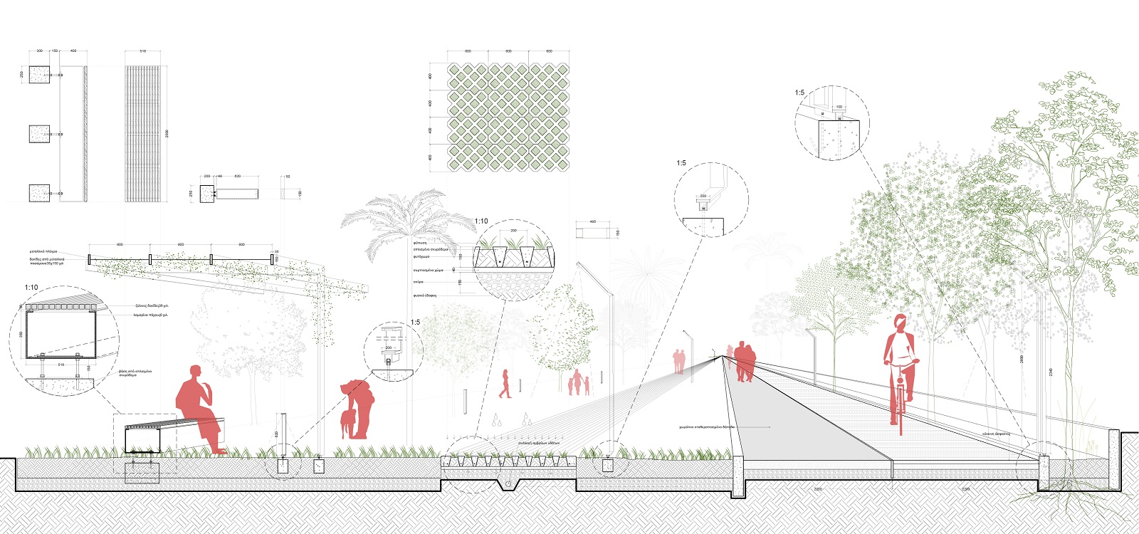 “Για σταθερό έδαφος, επιλέχθηκε το χωμάτινο σταθεροποιημένο δάπεδο, ενώ σκληρή επιφάνεια από σκυρόδεμα τοποθετείται μόνο στην πλατεία του πάρκου”.
