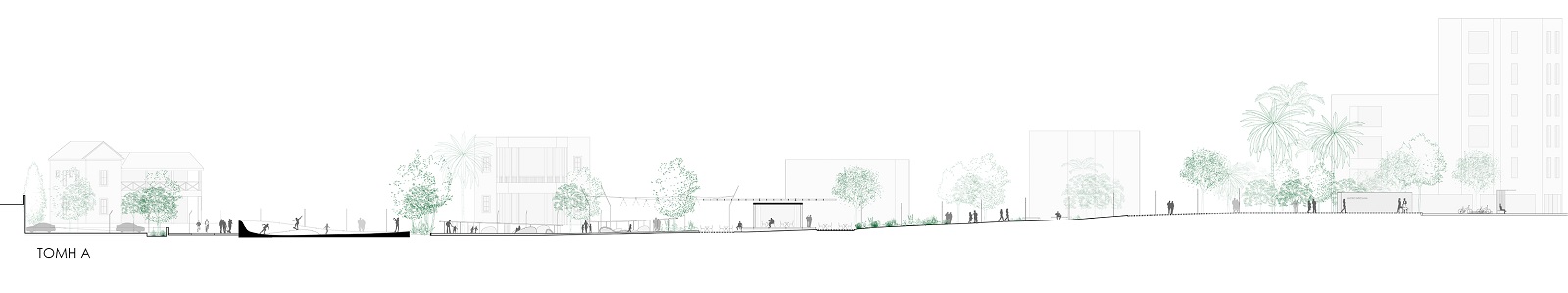 4. Παιδότοπος: Στην καρδιά της ενότητας αυτής συντάσσεται ένας νέος δημόσιος χώρος, διαμορφωμένος από μια επιμήκη χωρική κατασκευή. Η «γλυπτική» προσέγγιση του παιδότοπου αποζητά να προσφέρει εύρος ελκυστικών δραστηριοτήτων παιχνιδιού.