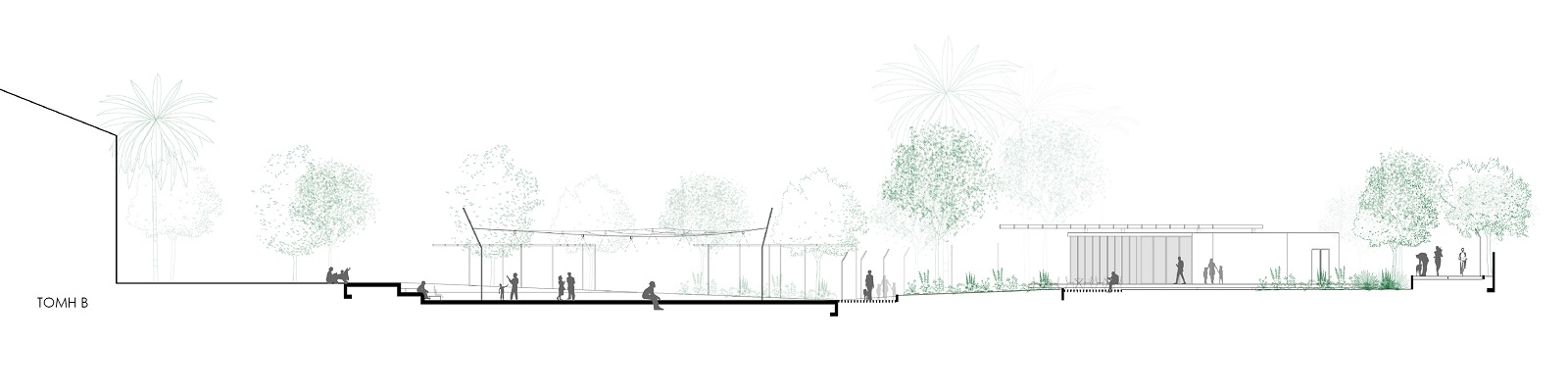 2. Κήπος: Για την δημιουργία μιας όασης στο αστικό τοπίο και για να προσδοθεί το αίσθημα της γαλήνης και της ηρεμίας χρησιμοποιείται πληθώρα ψηλών και με φύλλωμα δέντρων, το υγρό στοιχείο και ο ήχος του τρεχούμενου νερού, σε έναν χώρο όπου θα μπορεί κανείς να χαλαρώσει, να διαλογιστεί ή να διαβάσει ένα βιβλίο.
