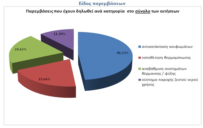 Τέλος, είναι αξιοσημείωτο, σύμφωνα με το ΥΠΕΝ, ότι, μεταξύ των περίπου 50.000 αιτήσεων που έχουν κατατεθεί, σχεδόν οι μισές παρεμβάσεις που έχουν δηλωθεί αφορούν αντικατάσταση κουφωμάτων.