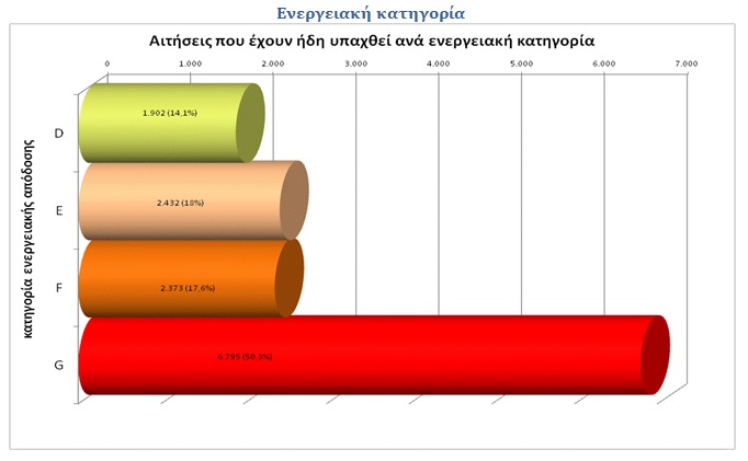 Εντύπωση προκαλεί το γεγονός, όπως εκτιμά το ΥΠΕΝ ότι, περισσότερες από τις μισές αιτήσεις που εγκρίθηκε ήδη η υπαγωγή τους ανήκουν στη χαμηλότερη ενεργειακή κατηγορία (G) και άρα η αναβάθμιση θα έχει σημαντικά αποτελέσματα. Μόλις 1 στις 7 ανήκει στην ανώτερη ενεργειακή κατηγορία για την οποία είναι εφικτή η υπαγωγή (D).