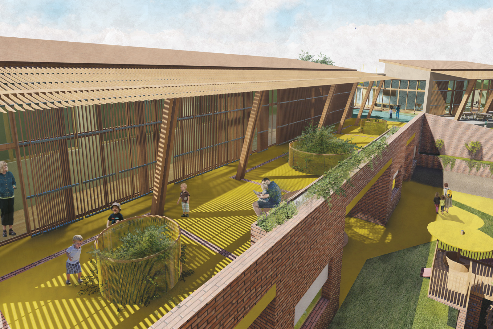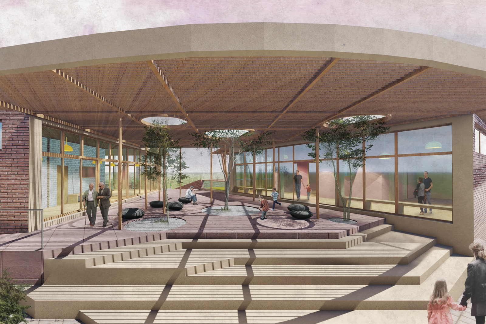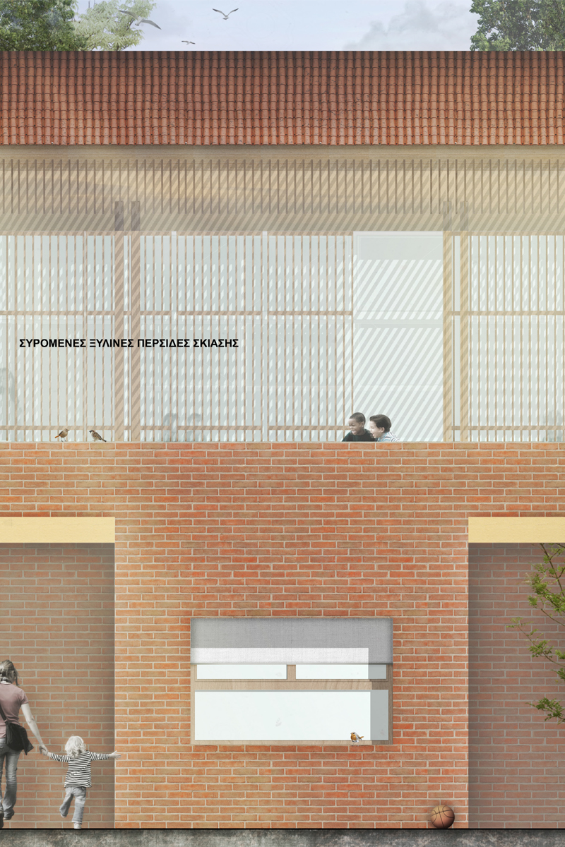 Η αίσθηση αυτή ενισχύεται ακόμα περισσότερο με την παρουσία του κοινού στεγάστρου που ενώνει τους κτιριακούςόγκους,καθώς και του δέντρου που τοποθετείται κεντρικά, παραπέμποντας στην δομή της παραδοσιακής πλατείας ως τόπο συνάθροισης και κοινωνικοποίησης.