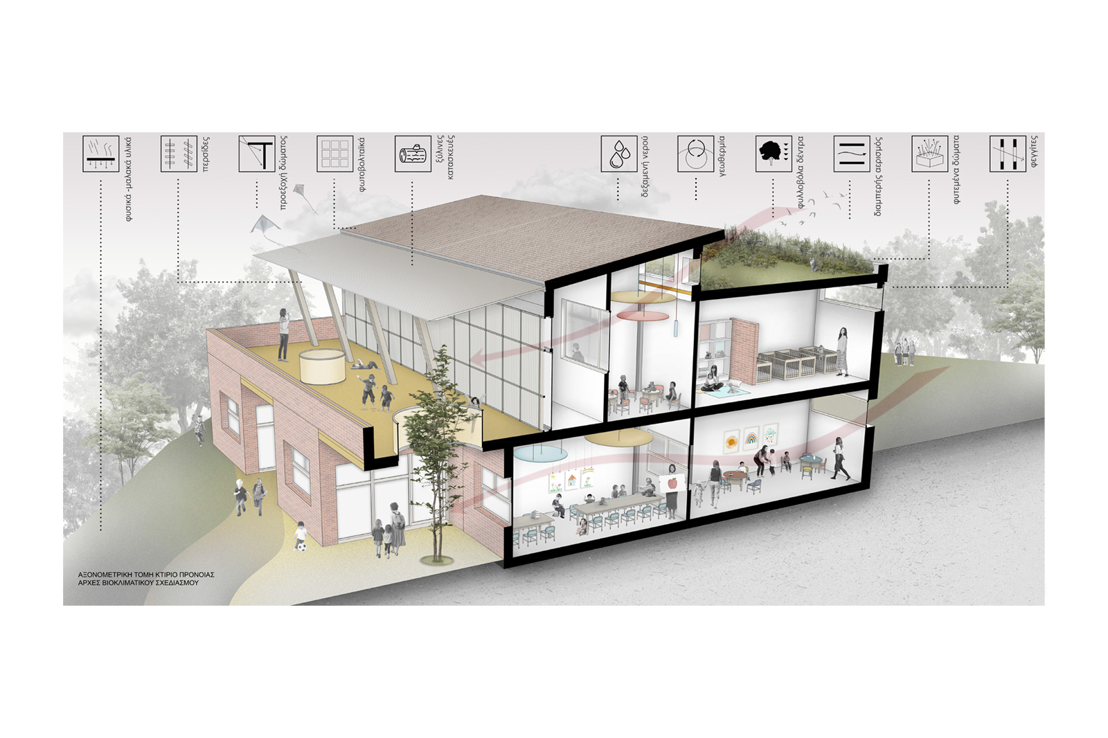 English description: The proposal of architect Georgina Andrei, in close collaboration with architect Georgios Petros Lazaridis, together with architect Athina Charalampidou, received honorable mention at the open architectural competition organized by the Municipality of Chania, for a Kindergarten, Elderly Care Center and Public Square in Chania, Crete.