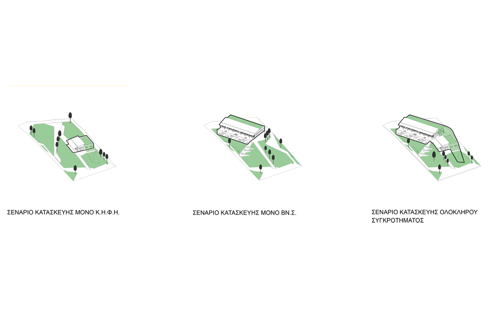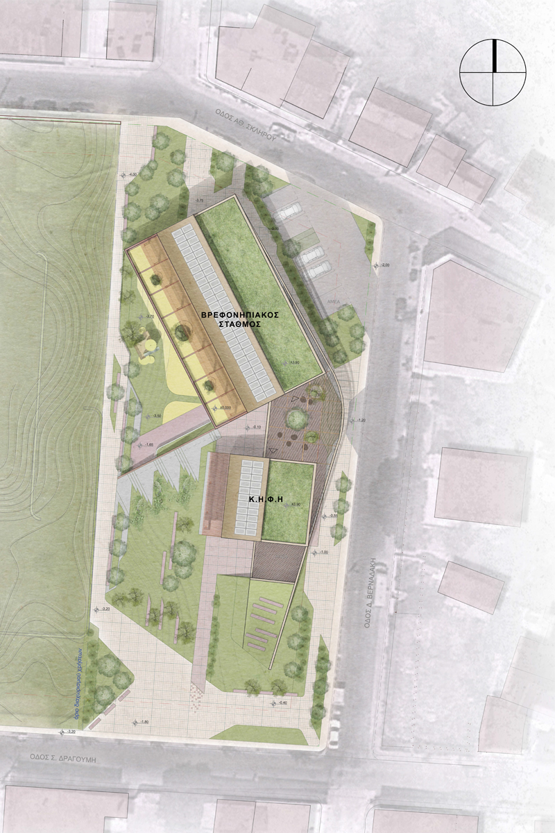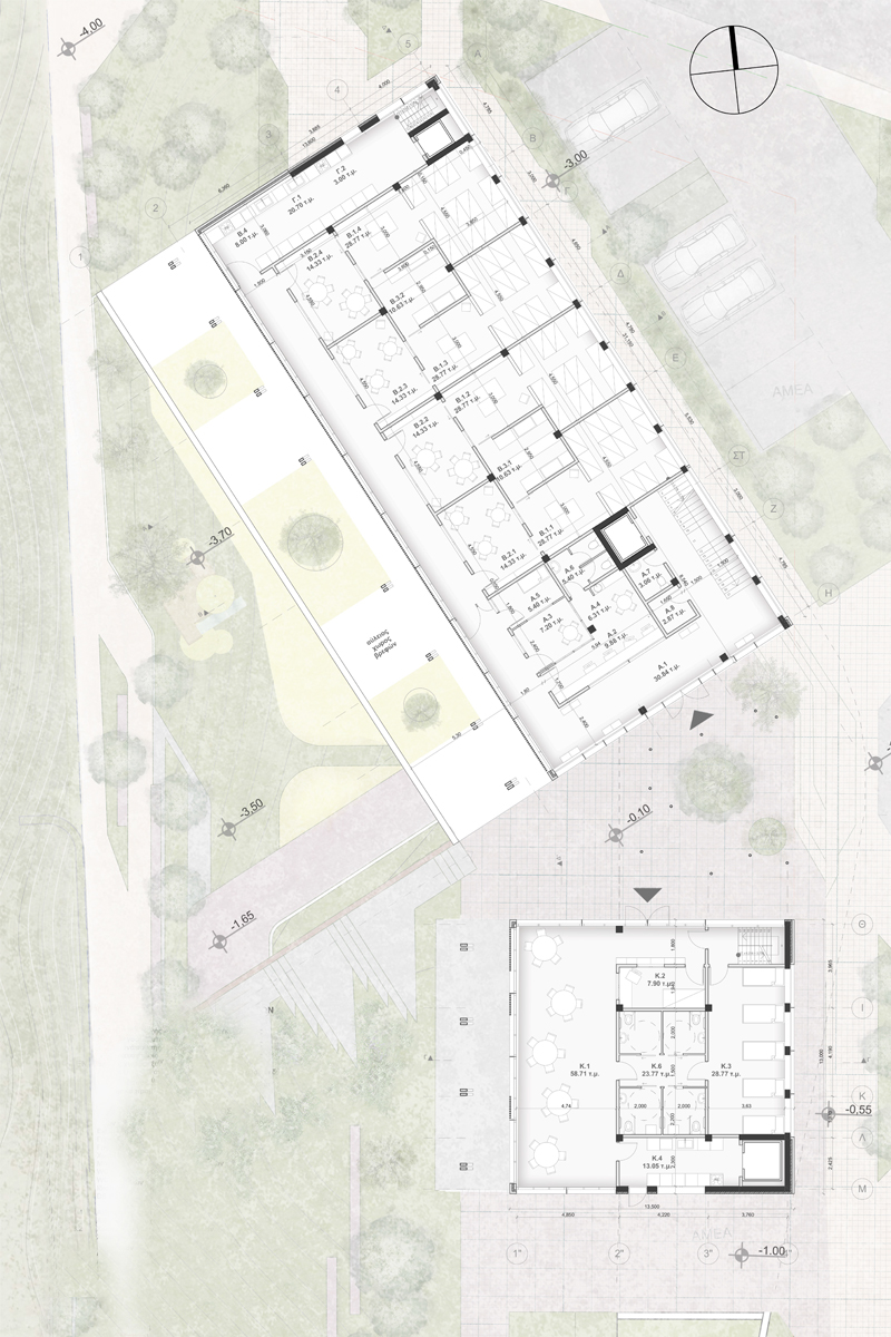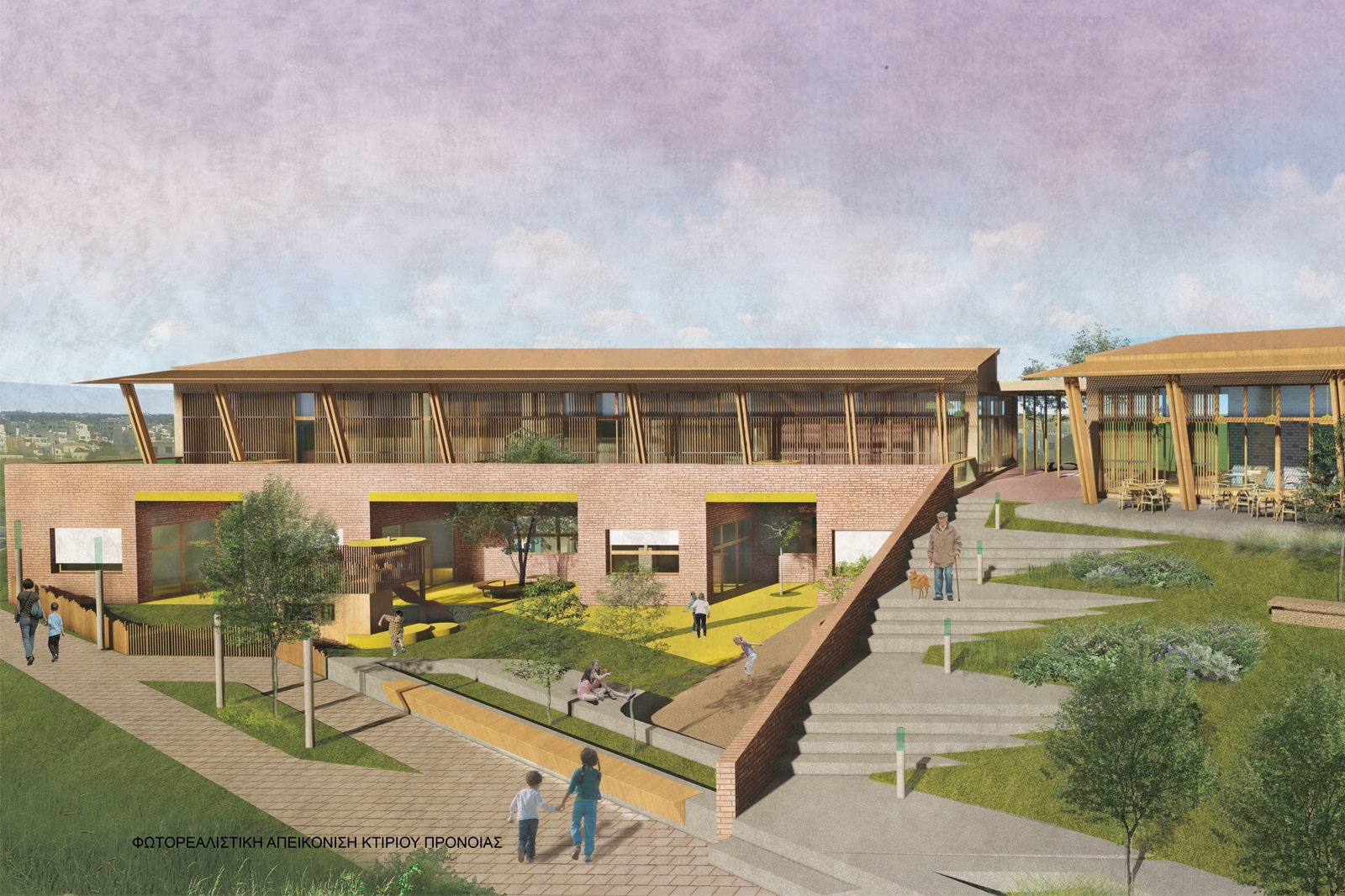 Starting as an extension of the soil, it is formed gradually, always keeping its earthly character; it is an embrace that sinks into nature and penetrates it. The age gap is seen as a springboard for new functional schemesand relationships, signaling a different social perspective in the concept of neighborhood and beyond. The main criterion of the idea was to maintain and strengthen as much as possible, the green of the site and the final configuration to be directly in harmony with the environment.
