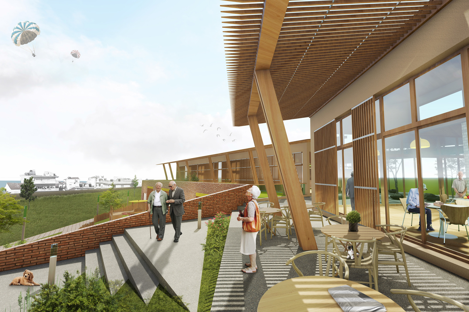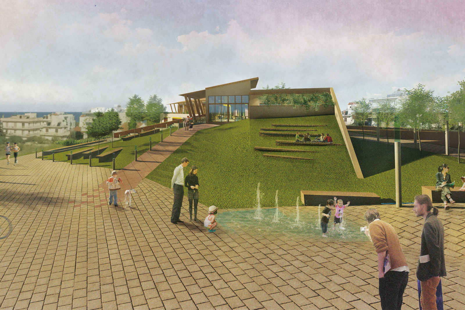 Η σύνθεση βασίστηκε στην πρόθεση για το σχηματισμό ενός κτιρίου, που αναδύεται από τη φύση και γεφυρώνει τις δύο χρήσεις, με μία κοινή είσοδο – εστία συνάντησης, κίνησης και αλληλεπίδρασης, που προεκτείνεται και σε ολόκληρη την εξέλιξη του πάρκου. Ξεκινώντας σαν προέκταση του εδάφους, σχηματίζεται σταδιακά κρατώντας πάντα τον γήινο χαρακτήρα του, αποτελεί μια αγκαλιά που βυθίζεται στη φύση και διαπερνάται από αυτήν. Το ηλικιακό χάσμα αντιμετωπίζεται ως εφαλτήριο νέων λειτουργικών σχημάτων και σχέσεων, σηματοδοτώντας μία διαφορετική κοινωνική προοπτική στην έννοια της γειτονιάς και όχι μόνο.