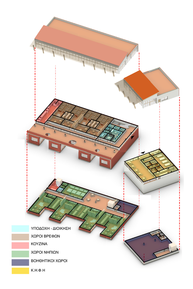 Κατά μήκος της νότιας όψης, υπάρχει διάδρομος, στον οποίον δίνουν οι αίθουσες απασχόλησης των βρεφών. Εκμεταλλευόμενη πλήρως την υψομετρική διαφορά του οικοπέδου, η αρχιτεκτονική λύση επιτρέπει τη δημιουργία δυο ορόφων, οι οποίοι από δυο διαφορετικές μεριές γίνονται ισόγειοι. Στο πάνω ισόγειο βρίσκονται οι χώρου των νηπίων.