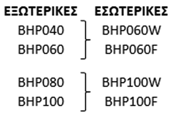 Οι εσωτερικές μονάδες, διατίθενται μόνο σε δύο μεγέθη. Καθένα από αυτά μπορεί να χρησιμοποιηθεί για δύο διαφορετικά μεγέθη εξωτερικής μονάδας. O συνδυασμός των εξωτερικών με τις εσωτερικές μονάδες πρέπει να γίνεται όπως παρουσιάζεται παρακάτω και δεν επιτρέπονται άλλοι πιθανοί συνδυασμοί.