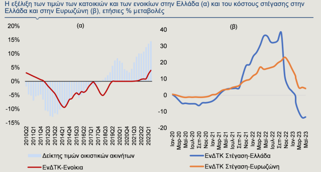 Σημαντική πτώση του κόστους στέγασης, το οποίο προσεγγίζεται από τη σχετική υποκατηγορία του Εναρμονισμένου Δείκτη Τιμών Καταναλωτή (ΕνΔΤΚ) και περιλαμβάνει, μεταξύ άλλων, το κόστος θέρμανσης και συντήρησης και το ενοίκιο καταγράφεται στη χώρα μας, από τις αρχές του 2023, καθώς το πρώτο πεντάμηνο του έτους μειώθηκε κατά 8,8% σε ετήσια βάση, έναντι ανόδου κατά 30,6%, το πρώτο πεντάμηνο του 2022, τονίζει η Alpha Bank.
