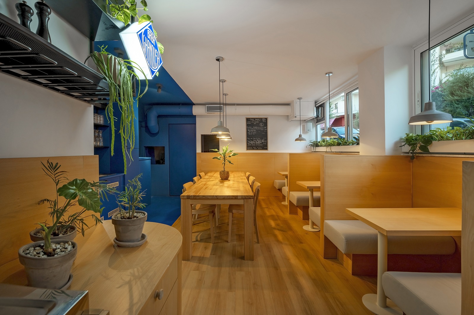 English description: On the ground floor of a typical Athenian apartment block of the 1970s, Plaini and Karahalios Architects designed Baba Ghanoush Falafel Shop, aiming to create a modern restaurant in the heart of the Pagrati neighborhood, where bright colors and natural materials played a very significant role in the interior design concept.