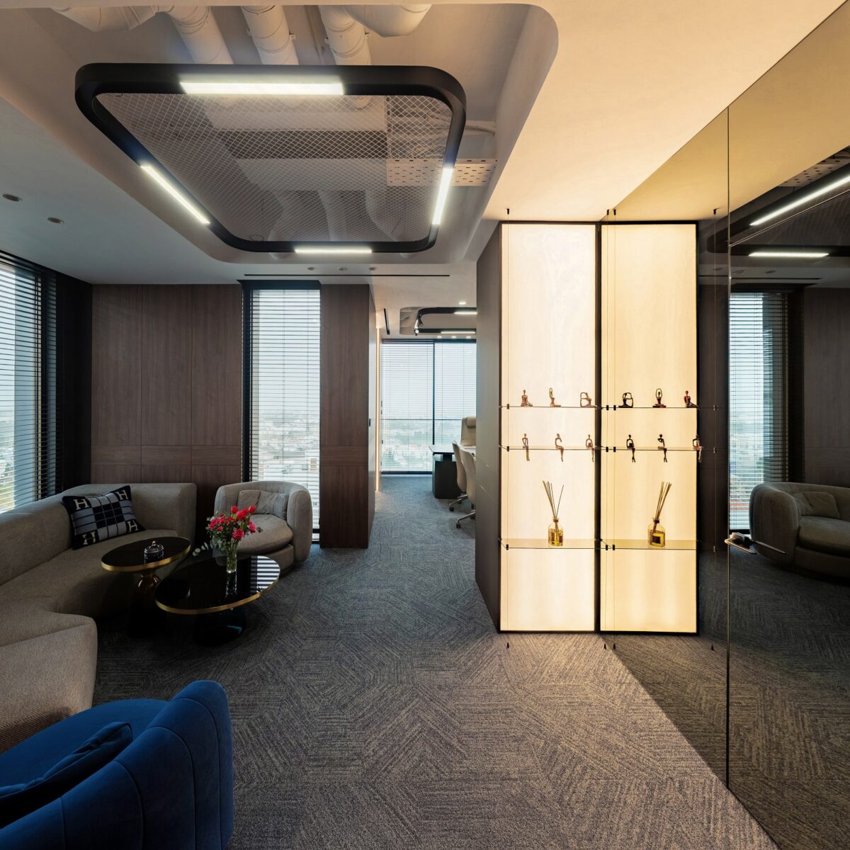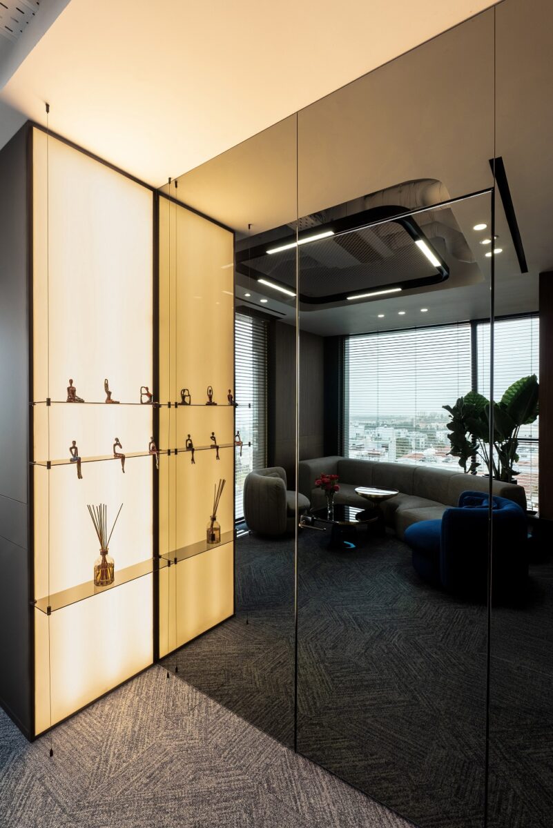 In the evening, when linear lighting forms a soft perimeter, the office becomes a place for reflection. Here, overlooking the Mediterranean horizon, true strength manifests itself in harmony: the ability to be effective, sensitive, professional and feminine.