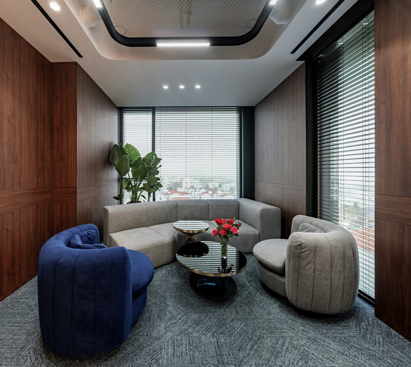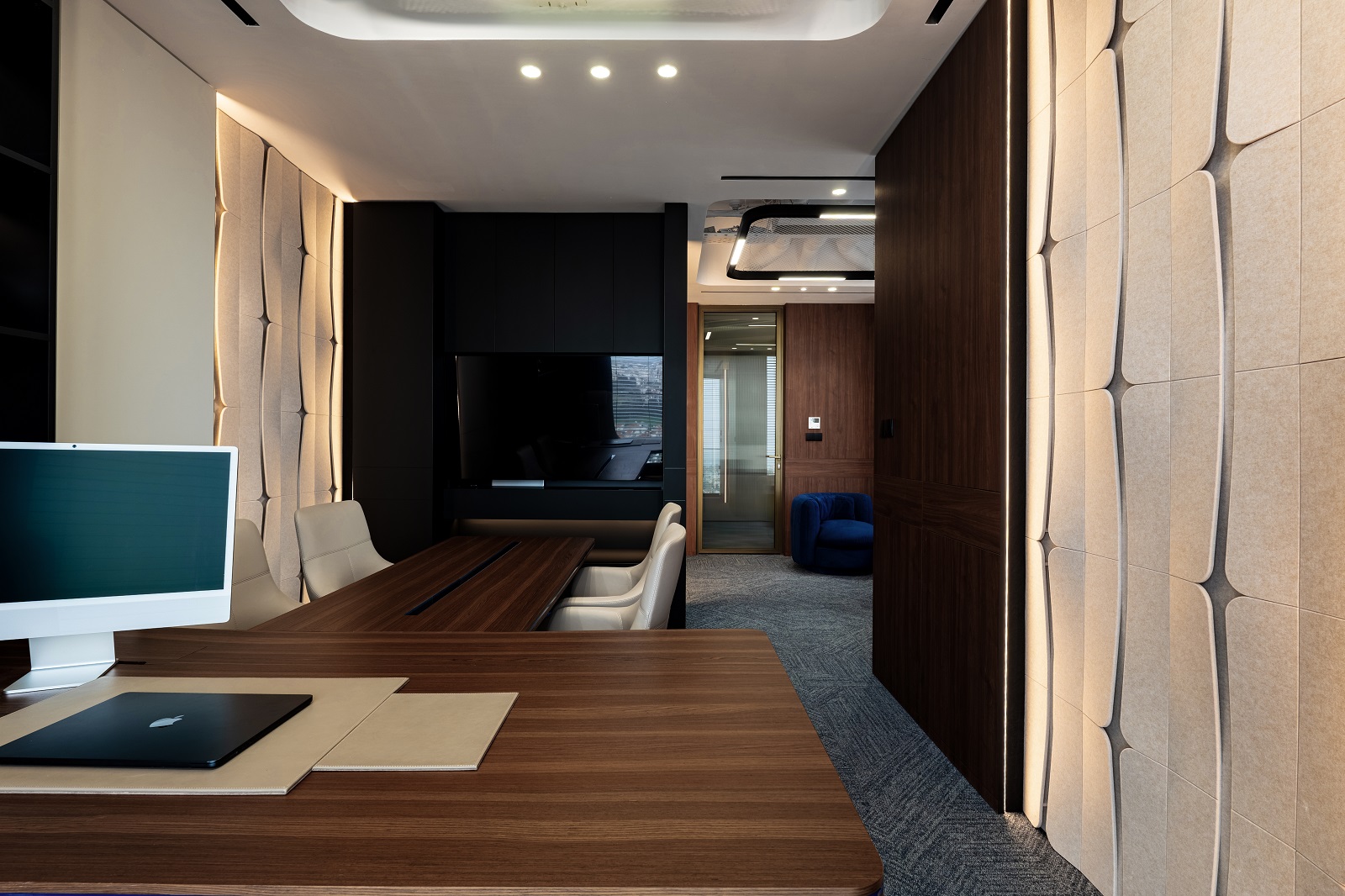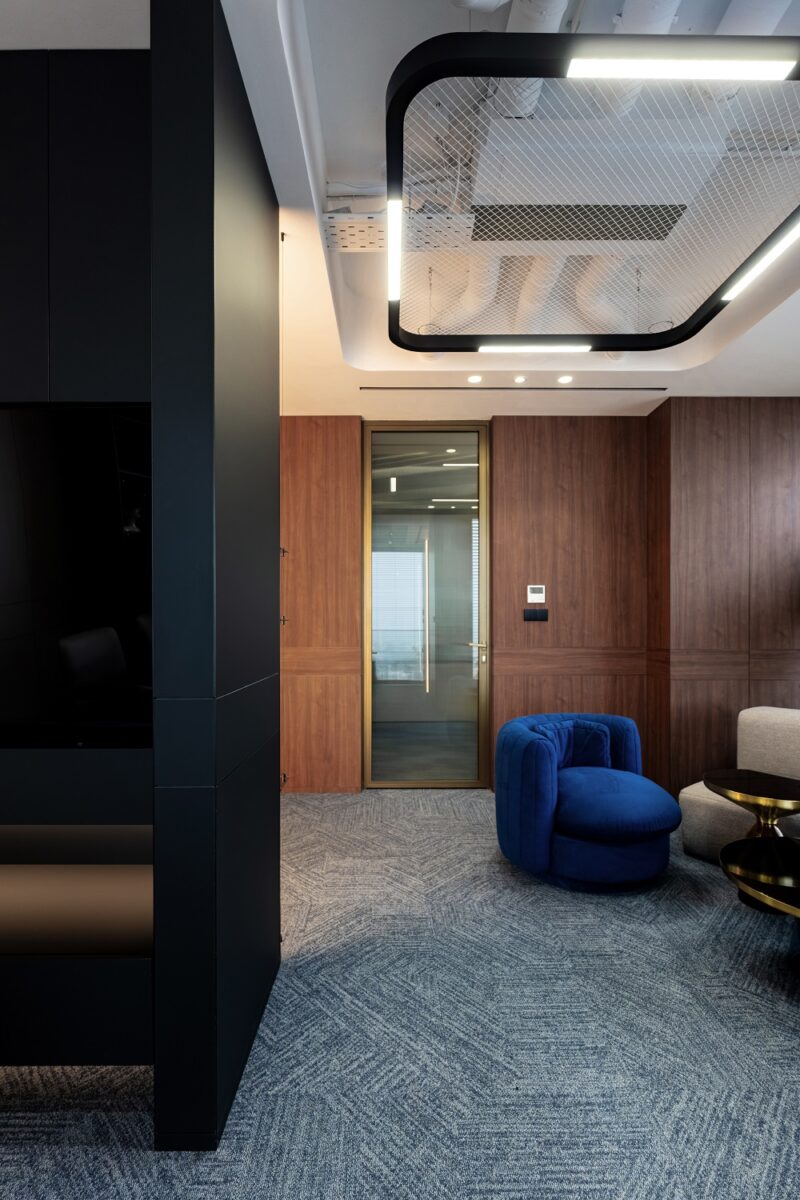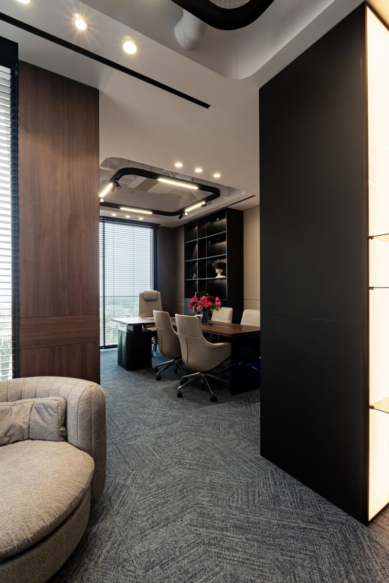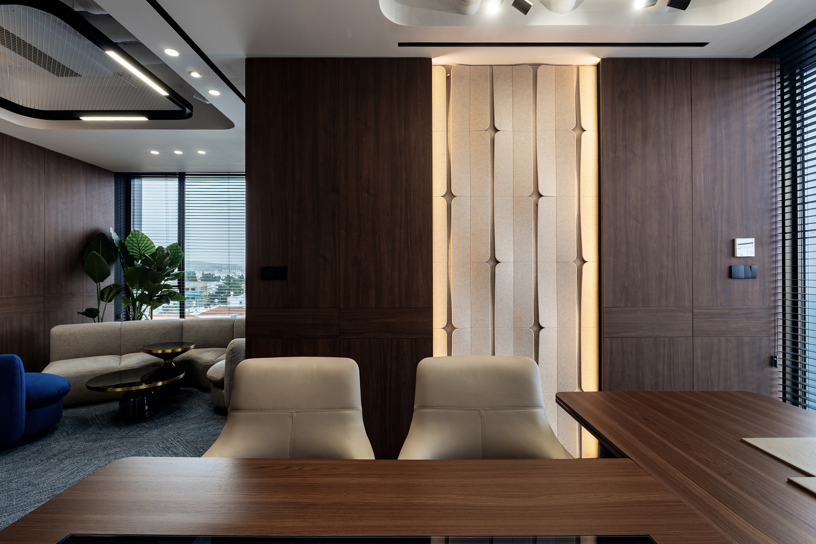 Multi-layered walls are used to ensure acoustic comfort and visual stability. Natural walnut finishes set a warm tone and structure the space. Accent 3D panels in the work area create a rhythmic play of light and shadow, changing throughout the day depending on the angle of the rays. This works as a dynamic tactile accent.