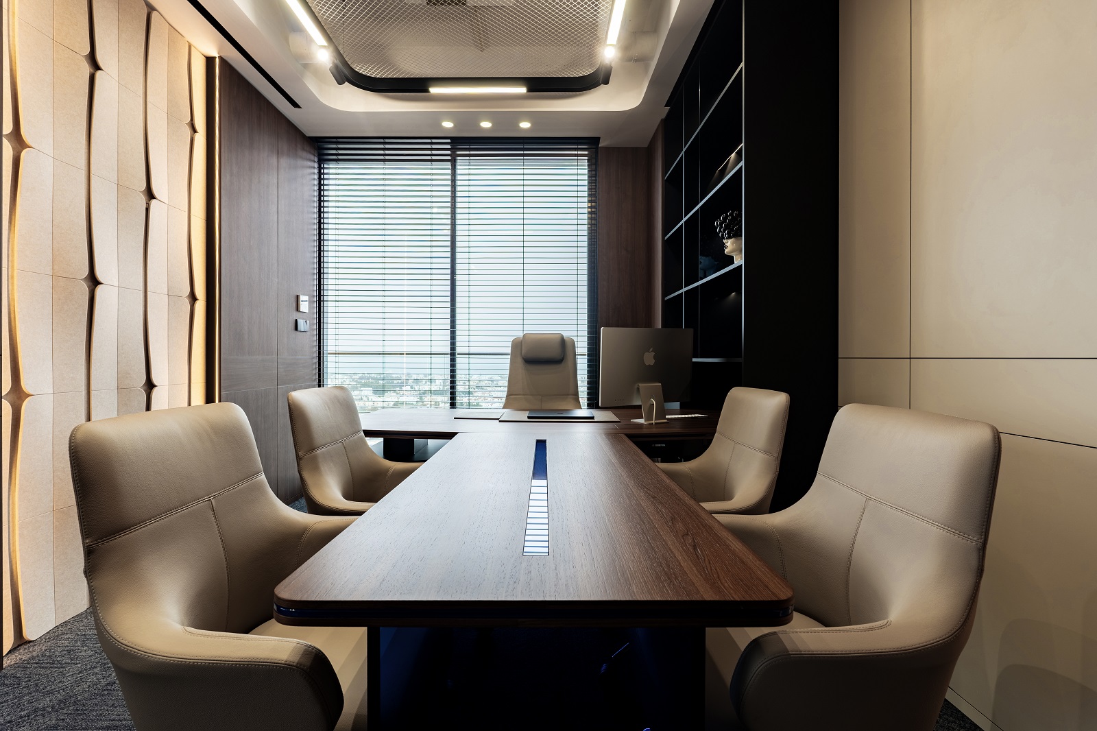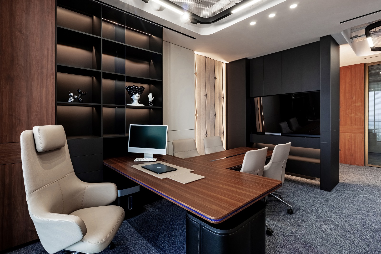The meeting area is organized as a hybrid transformative space. A T-shaped table with cobalt lighting and leather column legs structures the room and emphasizes its axial symmetry. Decorative shelves with designer objects add personality without distracting from business. Vitra chairs provide ergonomic support during long sessions, and an integrated media panel transforms the office into a presentation platform without compromising privacy. It is easy to focus on strategy or make important decisions here — the space is both focused and relaxed.