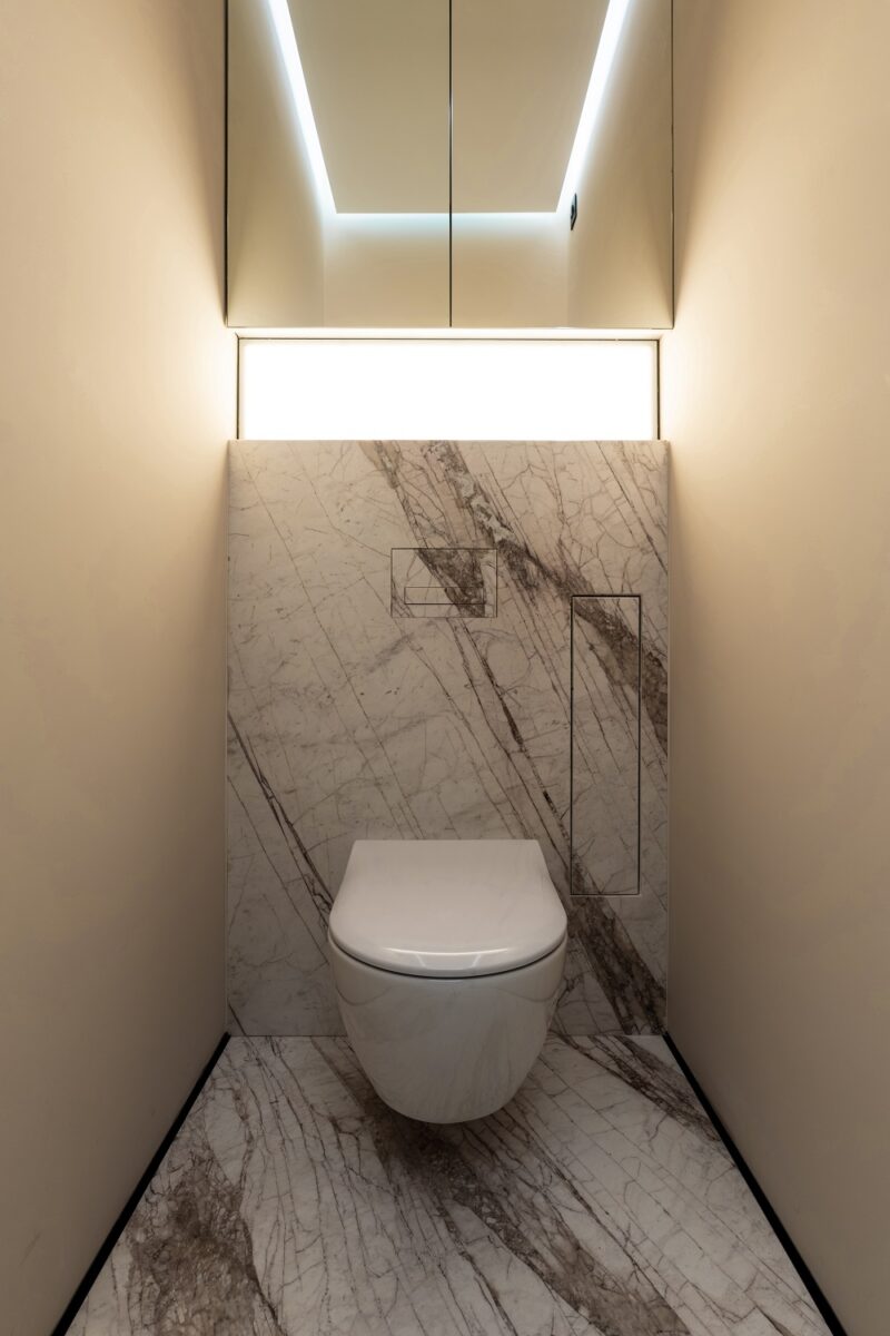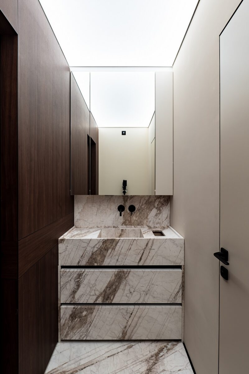 A graphite carpet with a geometric pattern acts as an acoustic damper and creates a feeling of soft silence and completeness. Attention to touch is also maintained in utilitarian areas. An array of natural stone in the bathroom makes this space a natural extension of the interior, where every surface is high-quality and complements the architectural integrity.