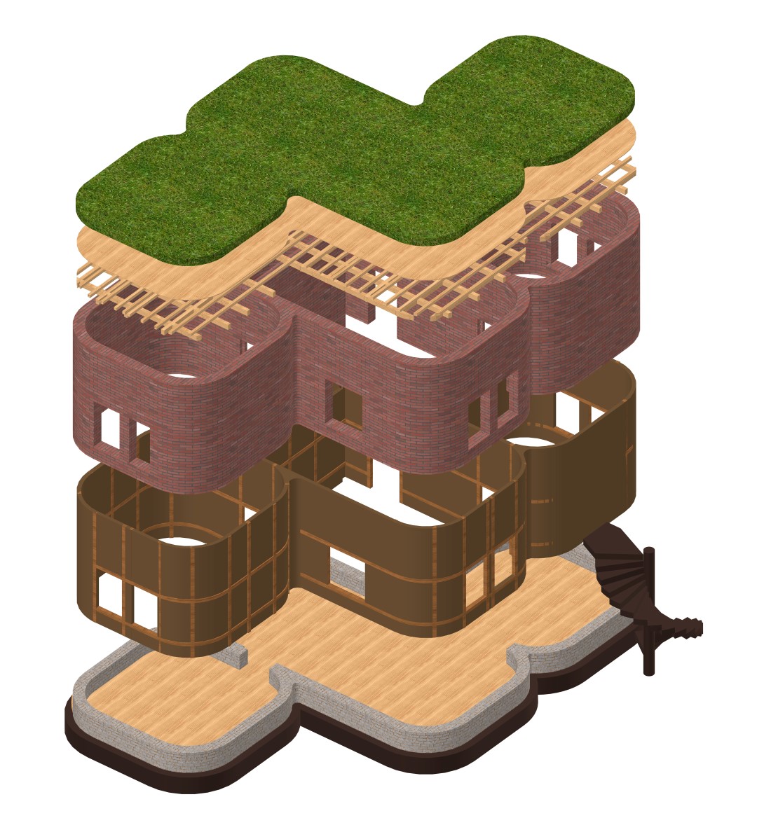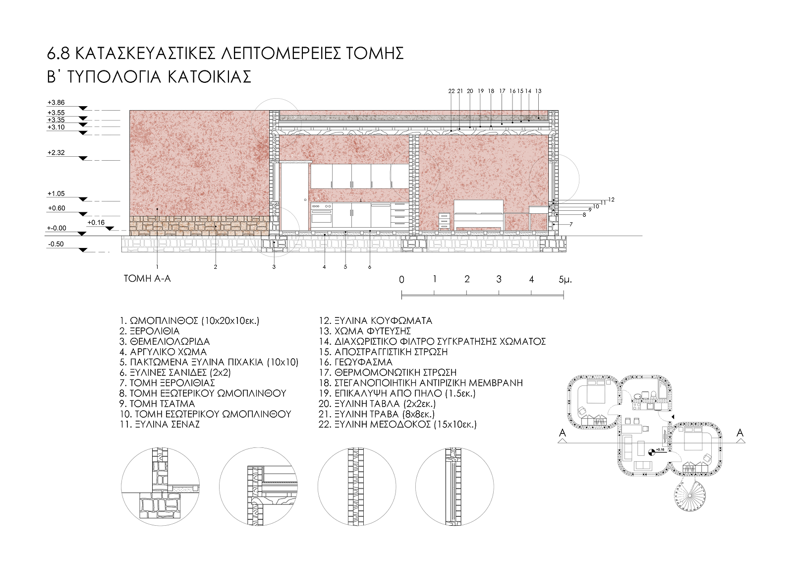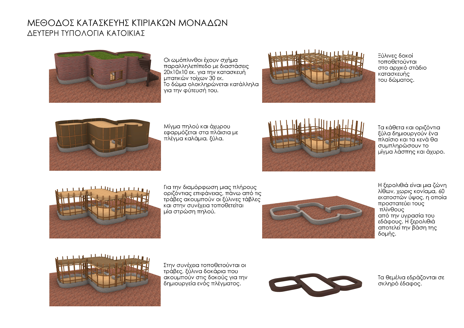 Η φυσική δόμηση των δομών γίνεται με το πλεονάζον προσφερόμενο ντόπιο υλικό της Λάρισας (τον πηλό και το χώμα). Χρησιμοποιήθηκαν ντόπια υλικά της Λάρισας για μηδενικό ενεργειακό αποτύπωμα. Οι ωμόπλινθοι ζυμώνονται με άχυρο, πηλό, χώμα, μπαίνουν σε καλούπια και στεγνώνουν στον ήλιο. Με την έκθεσή τους στον ήλιο απομακρύνεται η υγρασία. Πρόκειται για ωμόπλινθους διαστάσεων 10x10x20εκ., που διαστρώνονται στην εσωτερική και εξωτερική παρειά της τοιχοδομής. Ενδιάμεσα των παρειών μεσολαβεί ένα διάκενο 10 εκ. όπου συμμετέχει ο ξύλινος φορέας, εγκιβωτισμένος σε βάση πέτρινη, ύψους 60εκ. από το εξωτερικό δάπεδο.