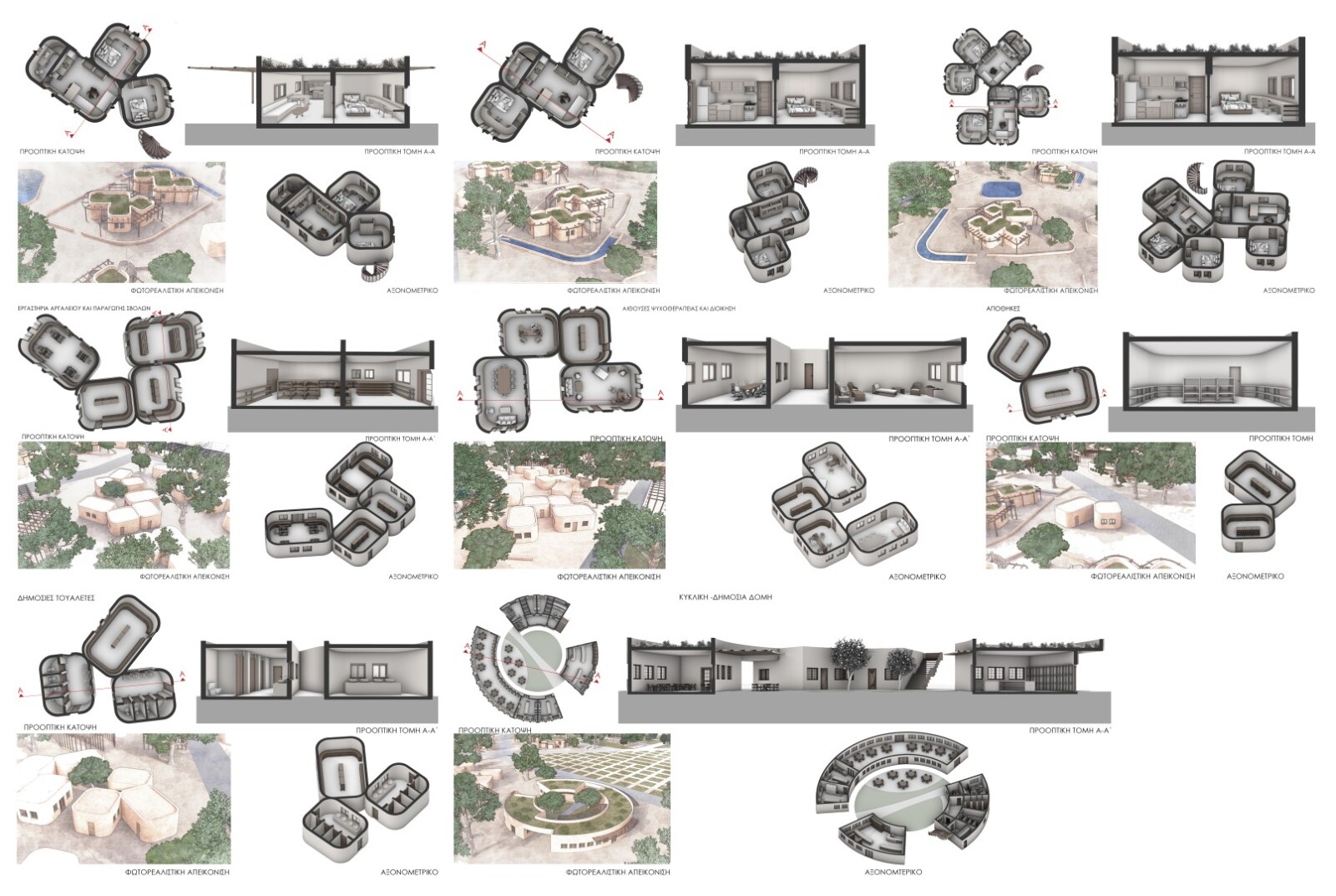 Οι δομές χωρίζονται σε ιδιωτικές δομές κατοίκησης και δημόσιες δομές (κυκλική δημόσια δομή, εργαστήριο αργαλειού και εργαστήριο σβόλων, αίθουσες ψυχοθεραπείας, αποθήκες και δημόσιες τουαλέτες) που τις απολαμβάνουν όλοι και έχουν πρόσβαση όλοι οι φιλοξενούμενοι, καθώς και οι εξωτερικοί επισκέπτες.
