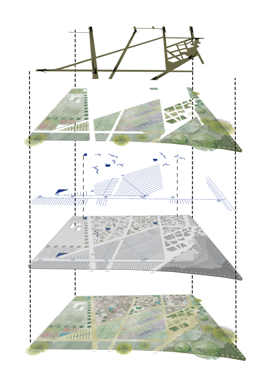 Οι χαράξεις των δρόμων, οι οποίες αποτελούν φυσική συνέχεια και συνενώνονται με τους δρόμους του ανατολικού και δυτικού μετώπου. Έτσι, το προηγούμενο ανοίκειο περιφραγμένο οικόπεδο του ΕΛΓΟ ΔΗΜΗΤΡΑ γίνεται οικείο, μιας και ο κάθε κάτοικος της περιοχής μπορεί να το διατρέξει- διασχίσει, για να περάσει πιο γρήγορα στο απέναντι μέτωπο, γνωρίζοντας την οικοκοινότητα. Κι αυτό αποτελεί την πιο δυναμική διάθεση εξωστρέφειας της εν γένει μελέτης στο οικόπεδο.