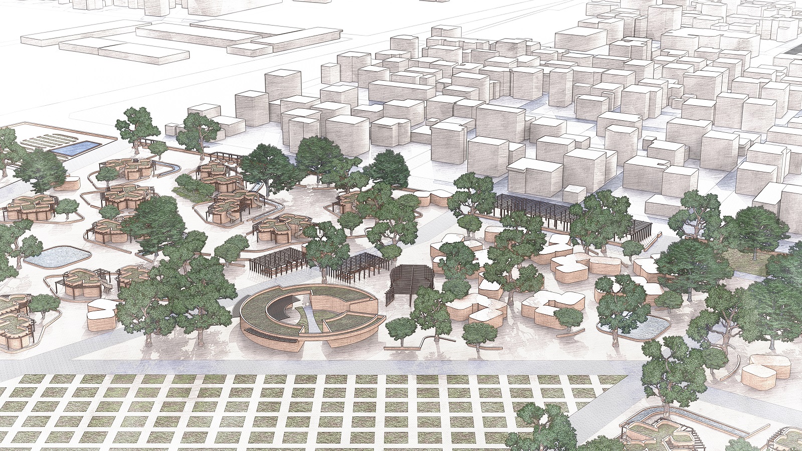 Ο κτιριακός όγκος του ΕΛΓΟ ΔΗΜΗΤΡΑ κρατήθηκε στη θέση του, αλλά μέσω δενδροστοιχίας περιμετρικά απομονώνεται οπτικά με διακριτικότητα.
