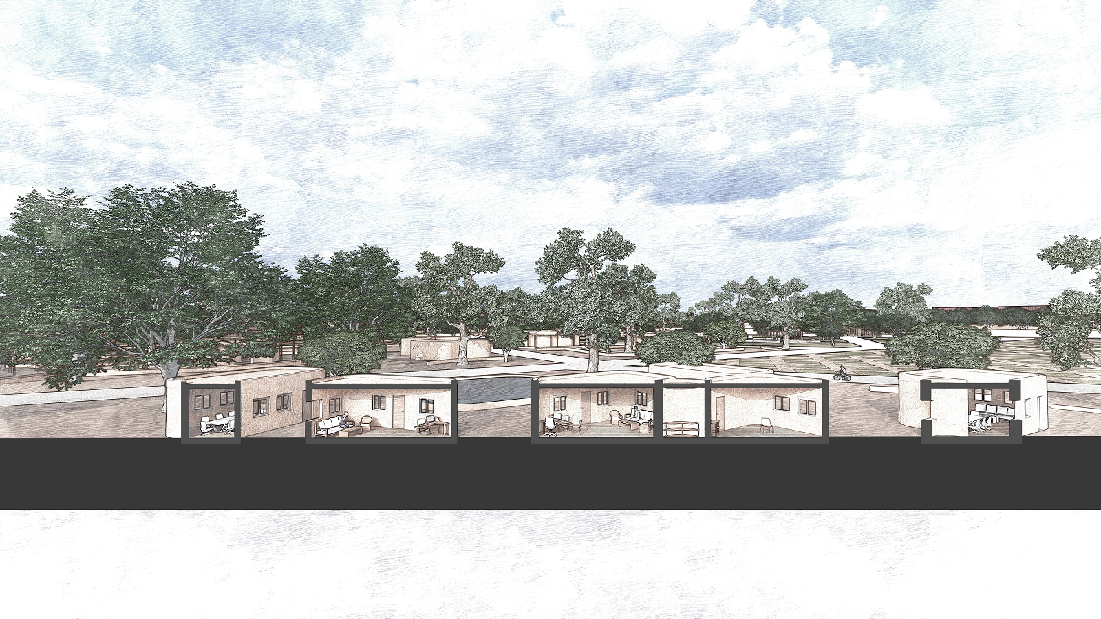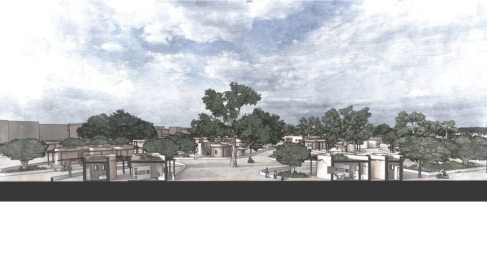 Μέσω της εξωστρέφειας του όλου εγχειρήματος, οι δρόμοι εκατέρωθεν των μετώπων εισχωρούν ως φυσική συνέχεια και εντός του οικοπέδου, και ενώνουν όλα τα μέτωπα μεταξύ τους (γύρω από το οικόπεδο), μέσω των περιπατητικών διαδρομών. Η οικοινότητα έχει τη δυναμική να φιλοξενήσει στις δομές μας 65-150 άτομα, για χρονικό διάστημα από 6 έως 12 μήνες. Είναι αυτό-οργάνωτη και οικονομικά ανεξάρτητη, μέσω στοχευμένων επιλογών στο πρόγραμμα λειτουργίας της. Στόχος της αρχιτεκτονικής μας πρότασης είναι: Η εξωστρέφεια, η κοινωνικοποίηση, η απο-ιδρυματοποίηση μέσω της συλλογικότητας και της συμμετοχικότητας, και η απόκτηση επαγγελματικής ταυτότητας (στον πρωτογενή τομέα – γεωργία), έτσι ώστε να λειτουργήσει ο όρος κοινωνική επανένταξη.
