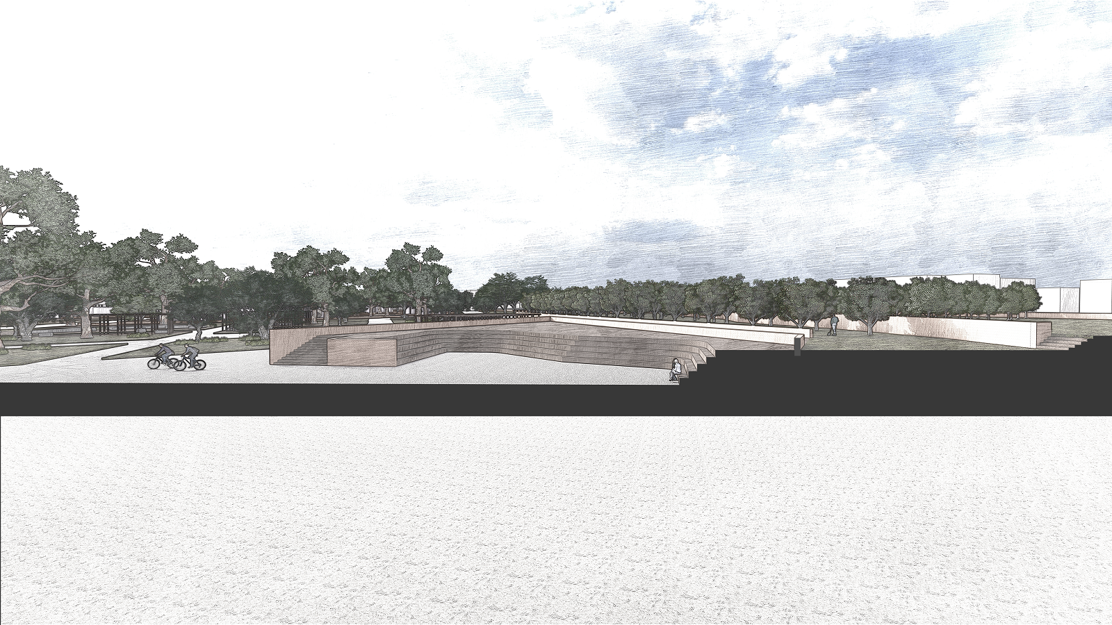 Το αλσύλλιο στο ΝΔ άκρο – γωνία του οικοπέδου εκμεταλλεύεται την υψομετρική διαφορά, από τη μοναδική υψομετρική καμπύλη, και είναι διαμορφωμένο σε πλατώματα. Εκεί βρίσκονται από τις δυο πλευρές τους εγκιβωτισμένες οι κερκίδες, σε ακανόνιστο σχηματισμό.