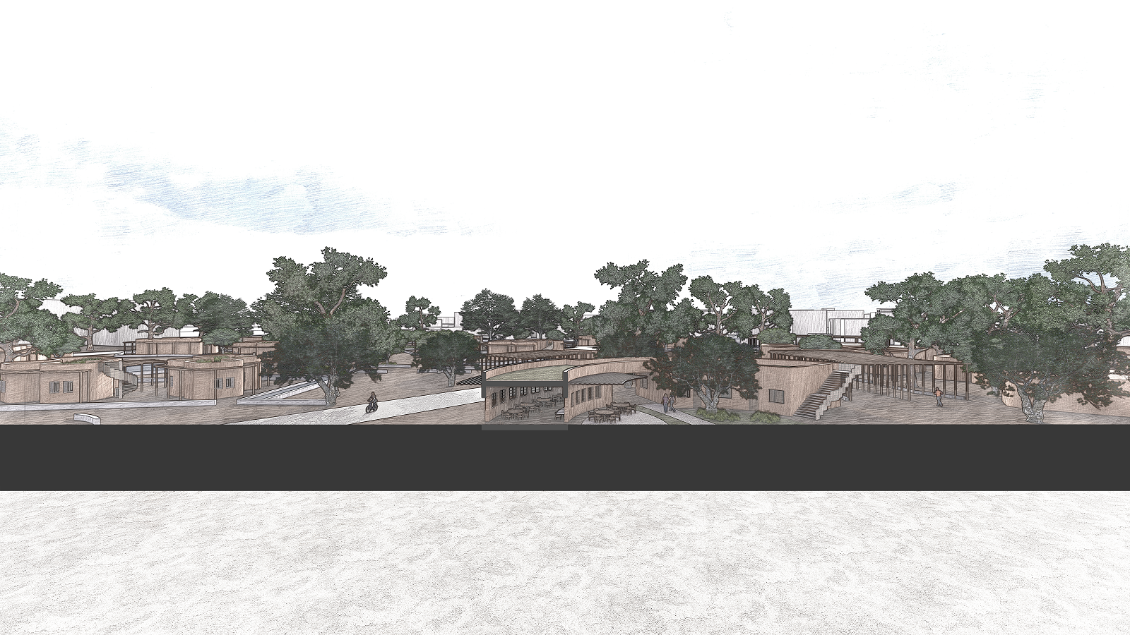 Όλοι οι κεντρικοί δρόμοι συναντώνται στην κυκλική δημόσια δομή. Εκεί στεγάζεται το εστιατόριο και οι συνεργατικές μας κουζίνες, άλλο ένα δείγμα εξωστρέφειας.