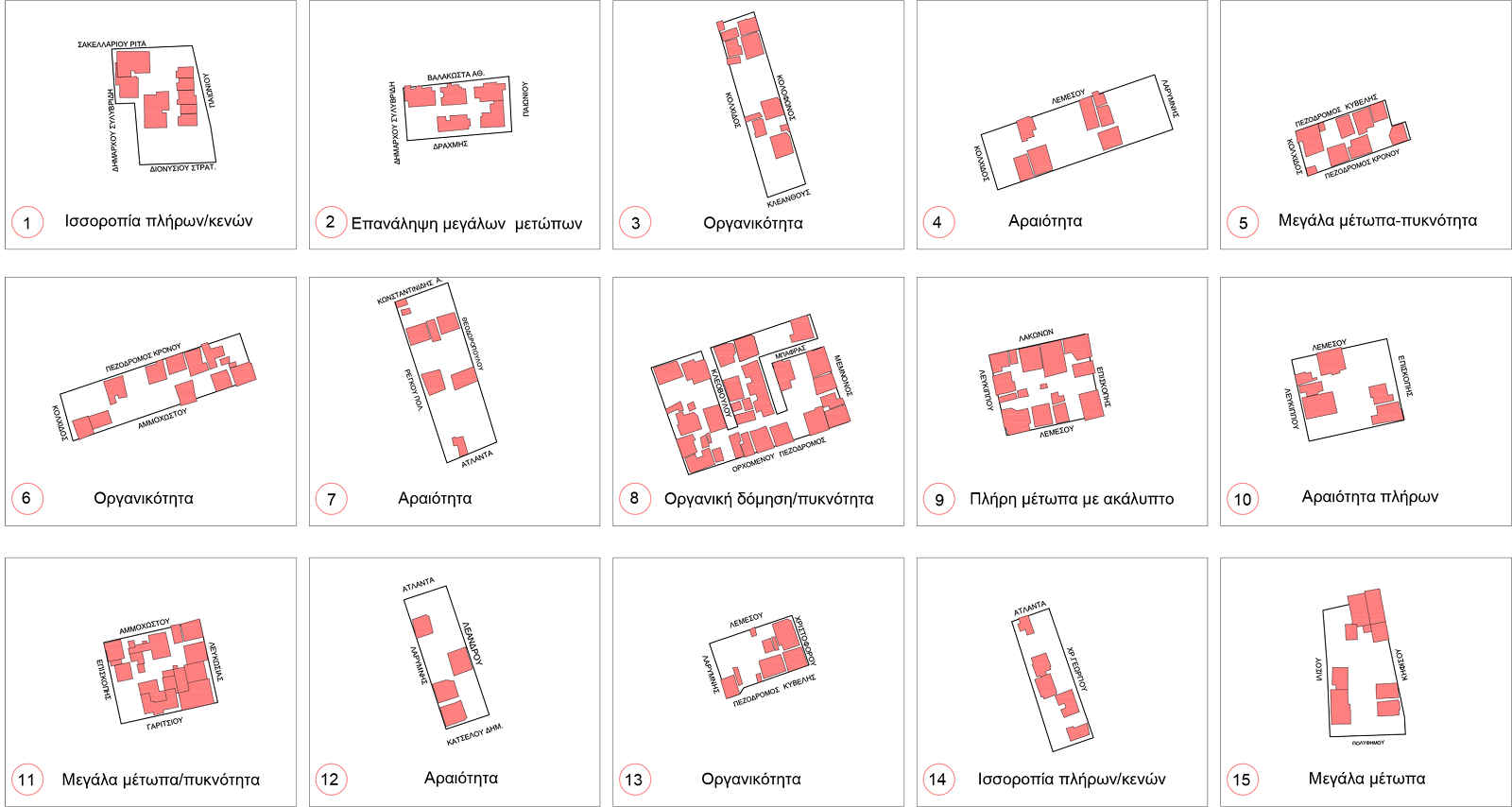 Είναι ισόγειες προς χάριν της στατικότητας και επιστέφονται με δώματα που είναι φυτεμένα, εκτός των εργαστήριων και αποθηκών. Συμπλέοντας με τους όρους της δημοκρατίας και ισονομίας, σχεδιάστηκαν δομές κατοίκησης οι οποίες καταμερίζονται με τα ίδια τετραγωνικά, τόσο στους ιδιωτικούς χώρους ύπνου, όσο και στους κοινόχρηστους χώρους. Οι δομές οργανώνονται σε επίπεδο γειτονιάς, μέσω τριών τυπολογιών. Αποτελούν δε συμπλέγματα που προάγουν την αίσθηση της οικογένειας, μέσα σ’ ένα συμβιωτικό πλαίσιο κατοίκησης, διαμένοντας σ’ αυτές δυο ή τέσσερα άτομα μαζί.