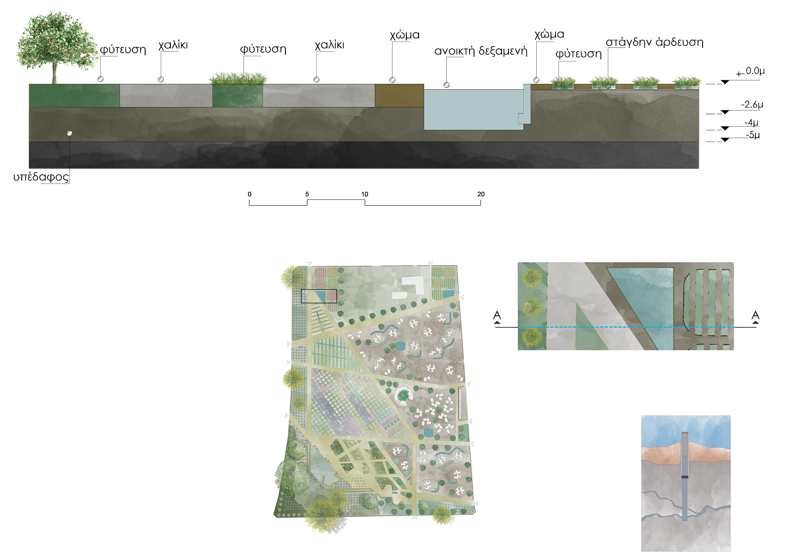 Οι φυτεύσεις περιβάλλονται από τα κεντρικά μονοπάτια, έτσι ώστε ο εξωτερικός επισκέπτης να τις αντιλαμβάνεται καθώς περιδιαβαίνει το οικόπεδο.