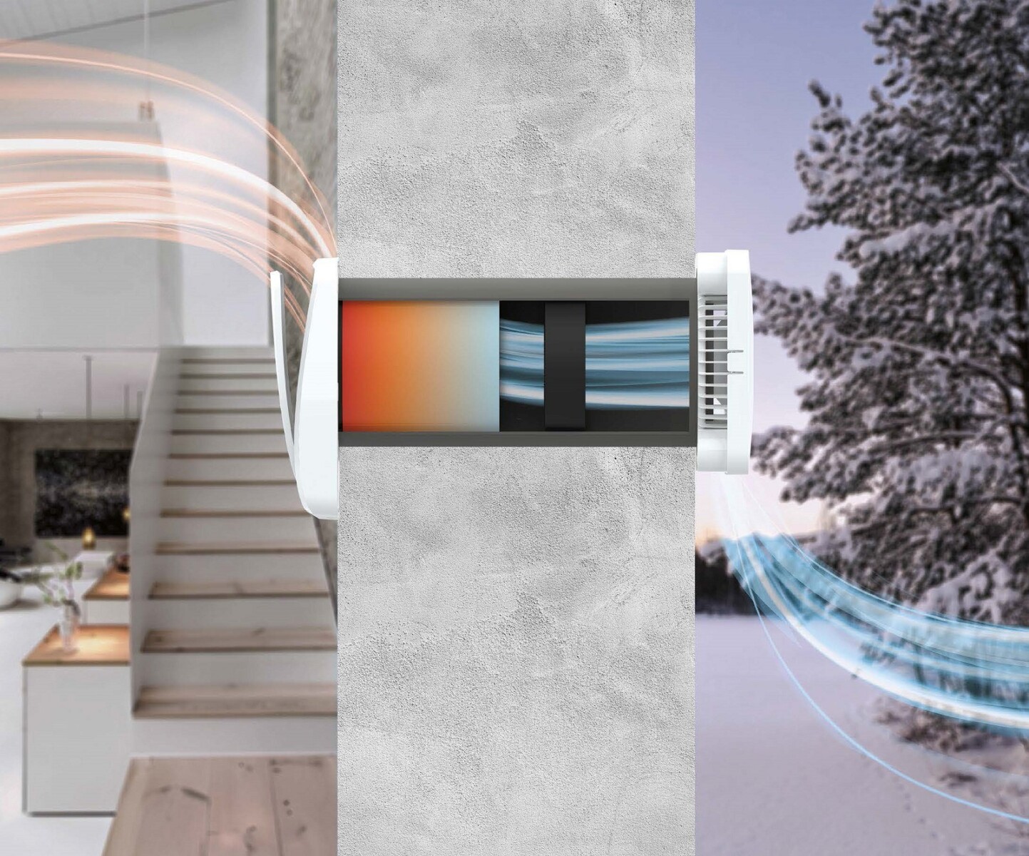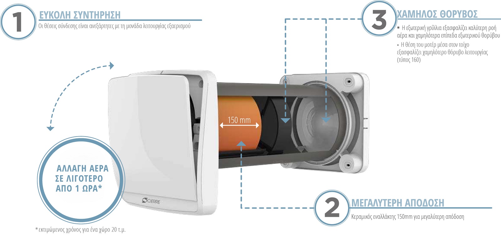 Με 3 επίπεδα απόδοσης και προρυθμισμένη νυχτερινή λειτουργία το σύστημα λειτουργεί αθόρυβα και αποτελεσματικά. Η ενσωματωμένη προστασία από εξωτερικούς θορύβους στο εξωτερικό κάλυμμα περιορίζει θορύβους απο το εξωτερικό περιβάλλον. Το μοτέρ τοποθετημένο δίπλα στον εναλλάκτη είναι χαμηλής κατανάλωσης νέας τεχνολογίας DC με ρουλεμάν χωρίς ψύκτρες (brushless) με ηλεκτρονική μεταγωγή (electronically commutated). Διπλά φίλτρα προστασίας που καθαρίζονται διατηρούν το χώρο σας καθαρό.