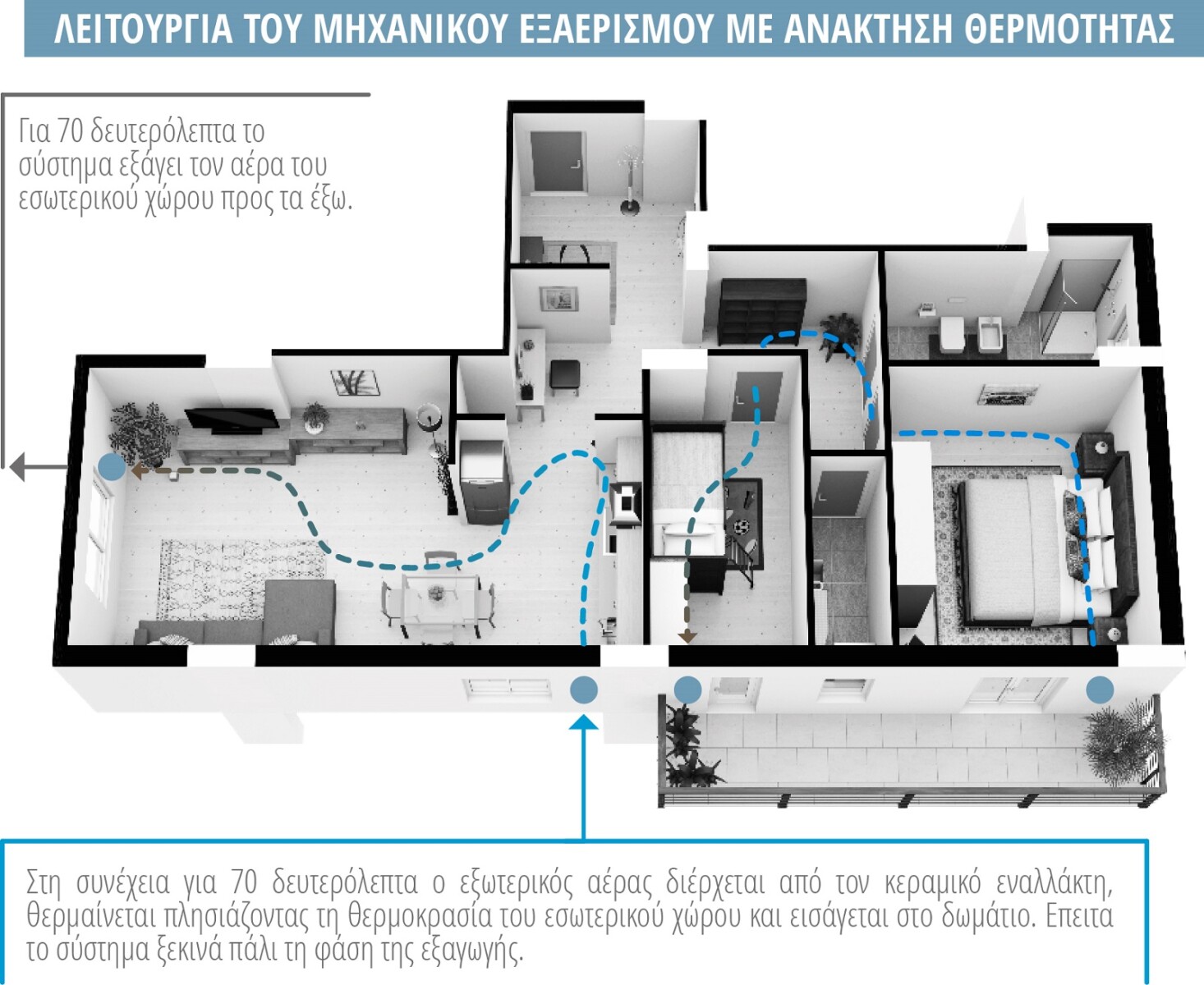 Ακριβώς όμως επειδή το περίβλημα των κτιρίων γίνεται αεροστεγές, τόσο πιο δύσκολη γίνεται η εισαγωγή του απαιτούμενου φρέσκου αέρα σε αυτά. Λόγω της έλλειψης επαρκούς αερισμού, αυξάνεται η υγρασία και οι ρύποι στο εσωτερικό των κτιρίων με αποτέλεσμα τη δημιουργία υγροποιήσεων σε τοίχους και κουφώματα, μούχλας και τελικώς τη δυσφορία των ενοίκων. Για την αποφυγή όλων αυτών χρησιμοποιείται σύστημα μηχανικού αερισμού με ανάκτηση θερμότητας (VMC).