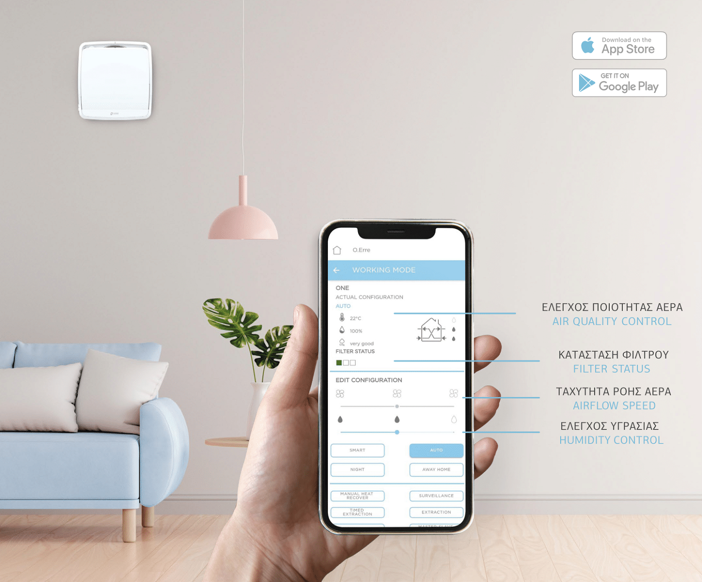 Οι ενσωματωμένοι αισθητήρες υγρασίας, φωτισμού, θερμοκρασίας και ποιότητας αέρα επιτρέπουν τη δυνατότητα ρύθμισης ιδανικών συνθηκών άνεσης στον εσωτερικό χώρο.