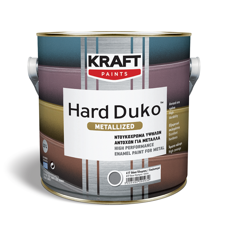 Το HARDDUKOMETALLIZED προσφέρει ματ και γυαλιστερό φινίρισμα και διατίθεται σε δύο ασημί αποχρώσεις που είναι οι βάσεις του συστήματος χρωματισμού KRAFTINSPIREDCOLOR και χρωματίζονται σε 13 ματ & 13 γυαλιστερές μεταλιζέ αποχρώσεις χρωματολογίου.