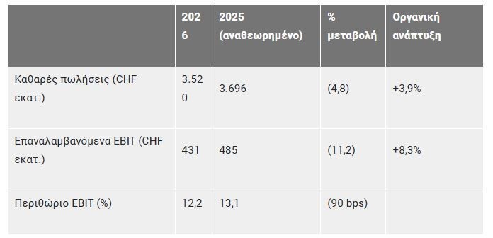 Οι καθαρές πωλήσεις ανήλθαν σε 3.520 εκατ. CHF, σημειώνοντας οργανική αύξηση 3,9%, με επιτάχυνση της δυναμικής τον Μάρτιο. Τα επαναλαμβανόμενα EBIT αυξήθηκαν οργανικά κατά 8,3% στα 431 εκατ. CHF. Το περιθώριο EBIT επηρεάστηκε από μεταβολές στο πεδίο δραστηριοτήτων κατά το Α’ τρίμηνο.