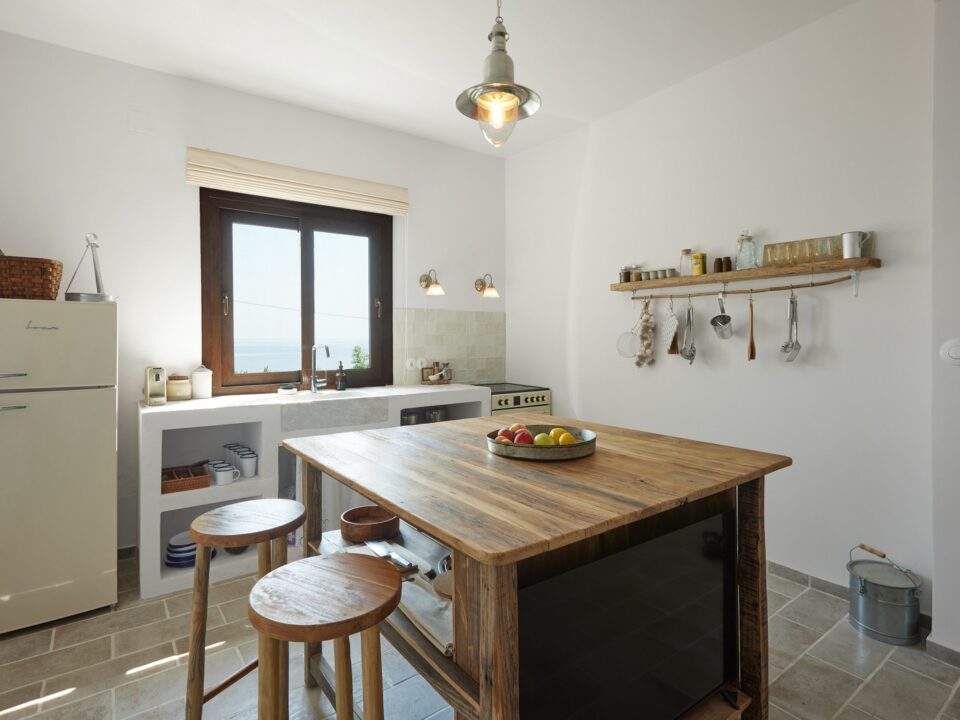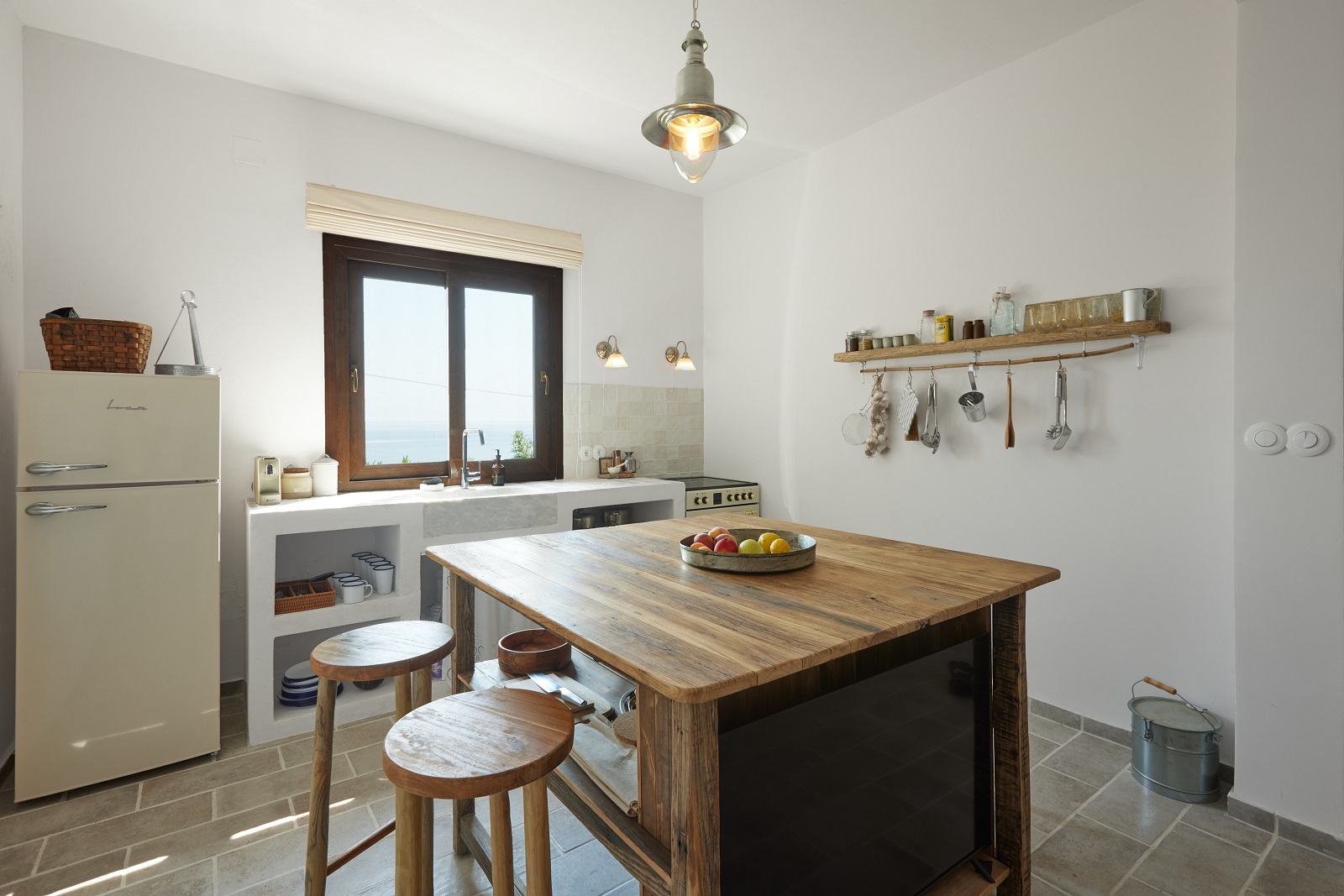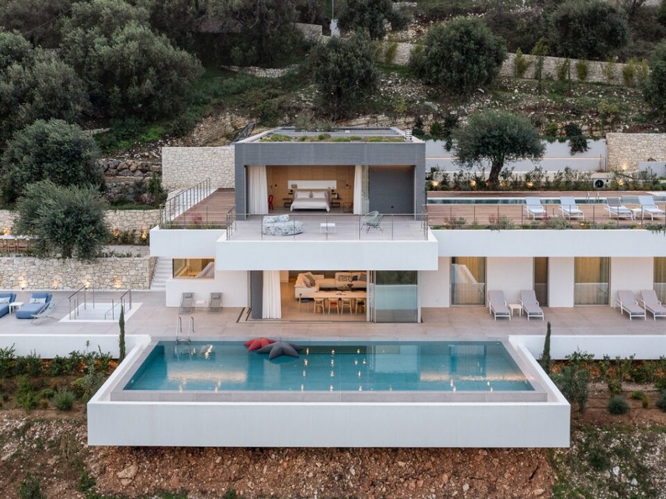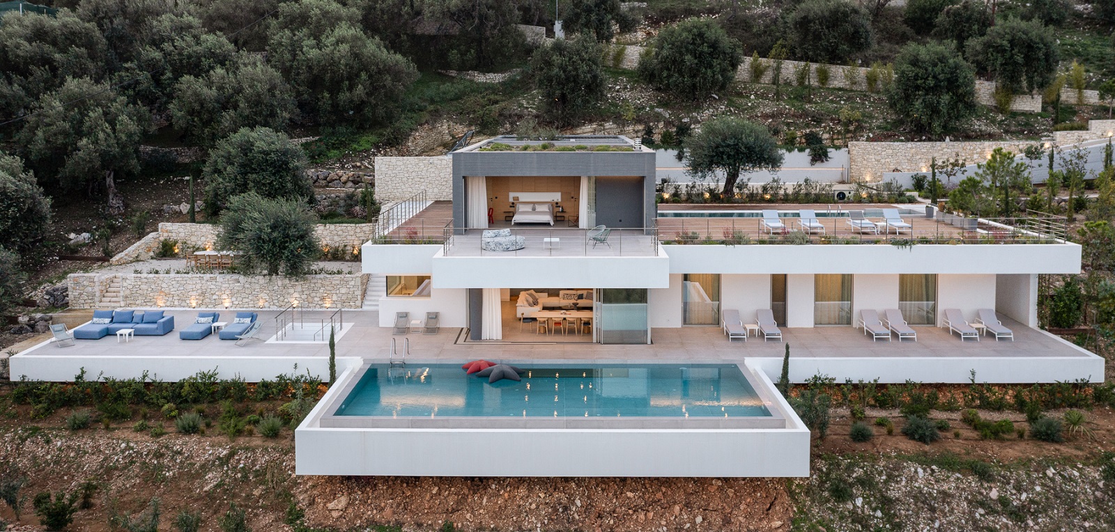 Στο ισόγειο και στον δεύτερο βρίσκονται αντίστοιχα οι χώροι υποδοχής, τα σαλόνια, οι τραπεζαρίες, οι κουζίνες και οι βοηθητικοί χώροι, με όλα τα υπνοδωμάτια να φιλοξενούνται στον πρώτο. Όσον αφορά τους εξωτερικούς χώρους, στην κάτω οικία ανήκουν ο κήπος και η πισίνα ενώ στην πάνω το πράσινο δώμα με πανοραμική θέα προς τα βουνά της Αθήναςκαι τον λόφο της Φιλοθέης. Οι κατοικίες μοιράζονται στο υπόγειο επίπεδο, ενιαίο πάρκινγκ και ανεξάρτητους αποθηκευτικούς χώρους.
