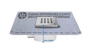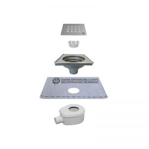 2) ΚΙΤ που περιλαμβάνει σχάρα με βάση, σύστημα σιφωνιού με έξοδο Φ40, υγρομονωτική μεμβράνη 1 m2 προσαρμοσμένη στο σιφώνι για εύκολη εγκατάσταση και ολικό ύψος εγκατάστασης 8 cm.