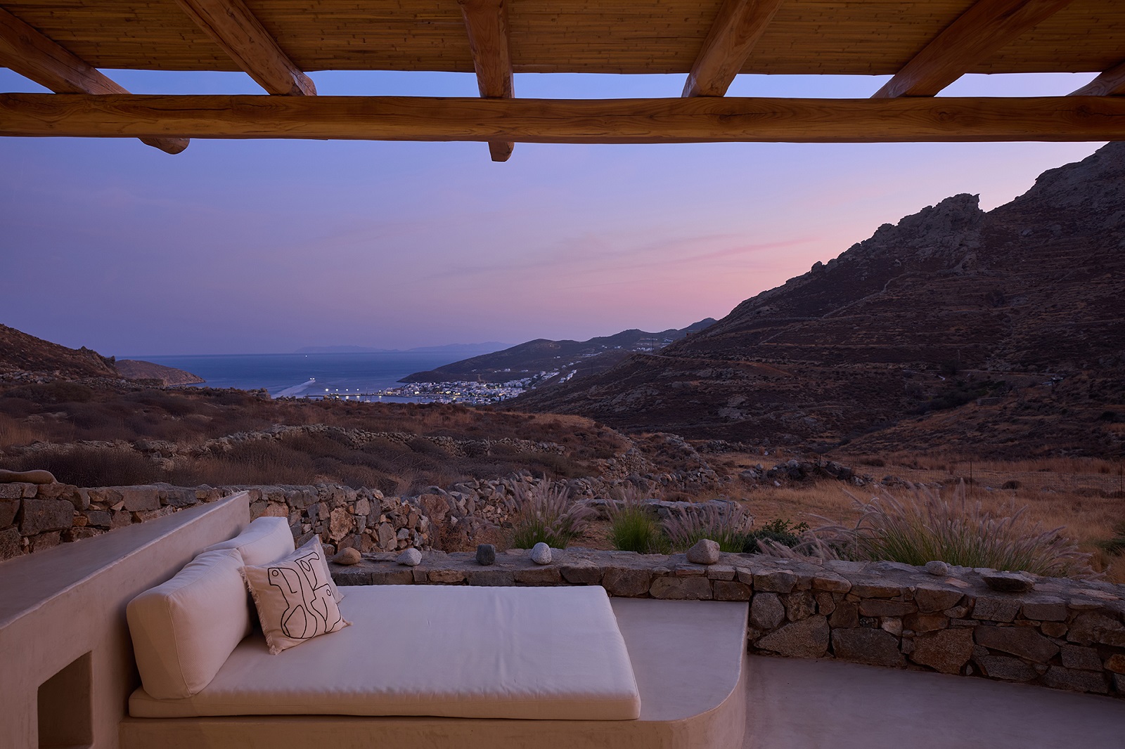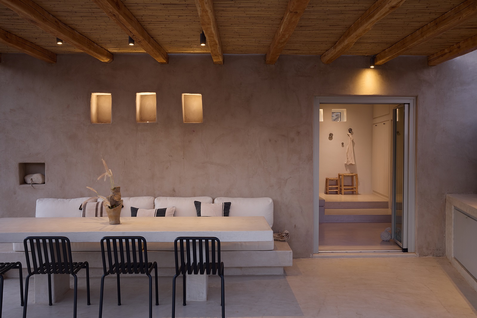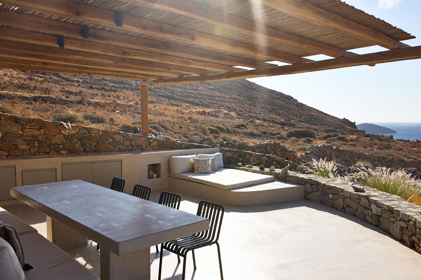 The outdoor courtyard, protected from the Cycladic winds, was designed as a space for relaxation and enjoyment of the view. It includes a large built-in dining area with a built-in sofa, an outdoor kitchen, and a daybed oriented toward the view of Chora. Shading is provided by a pergola made of natural chestnut wood and reed, creating a cool and inviting atmosphere, ideal for outdoor living.