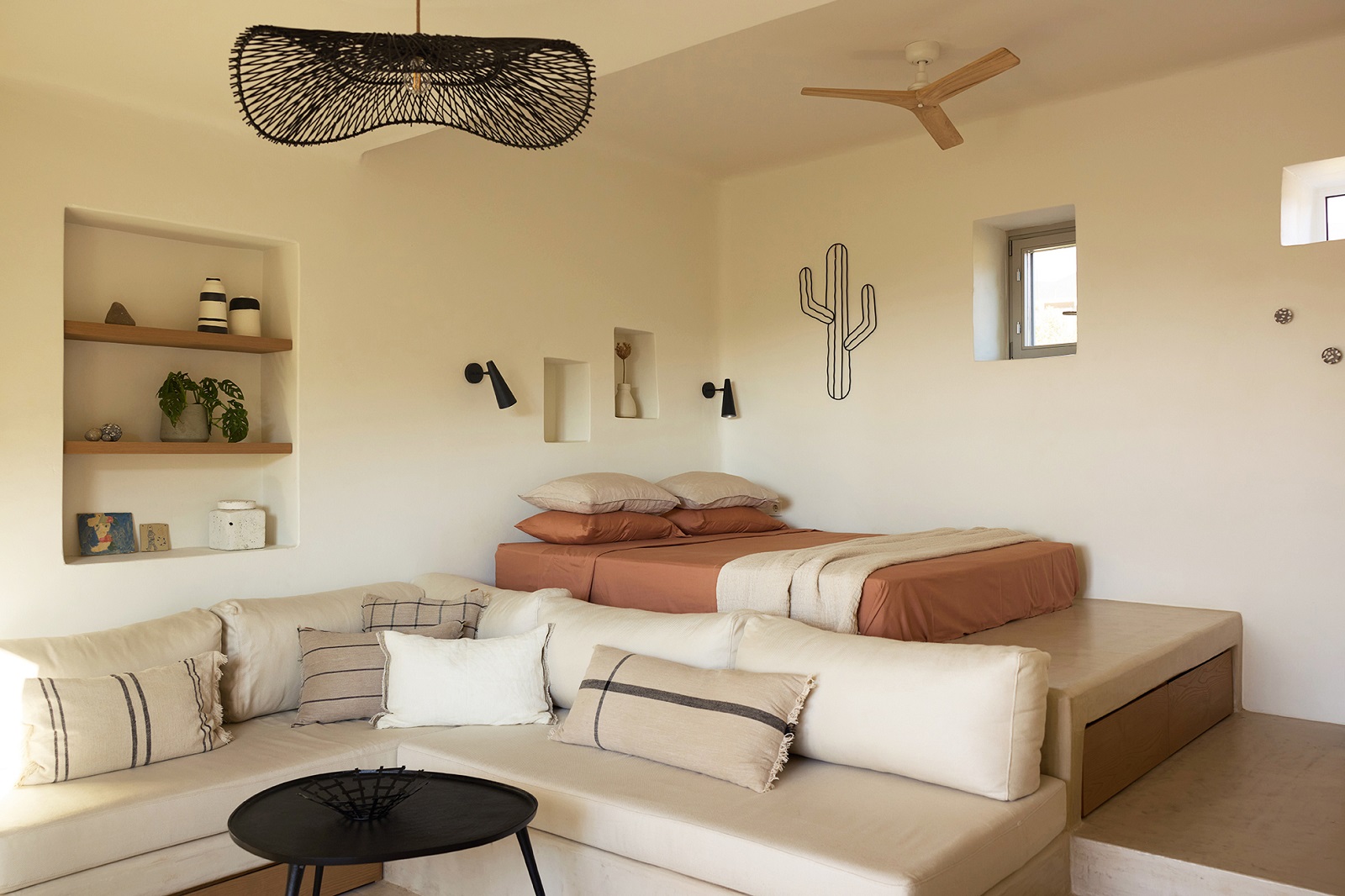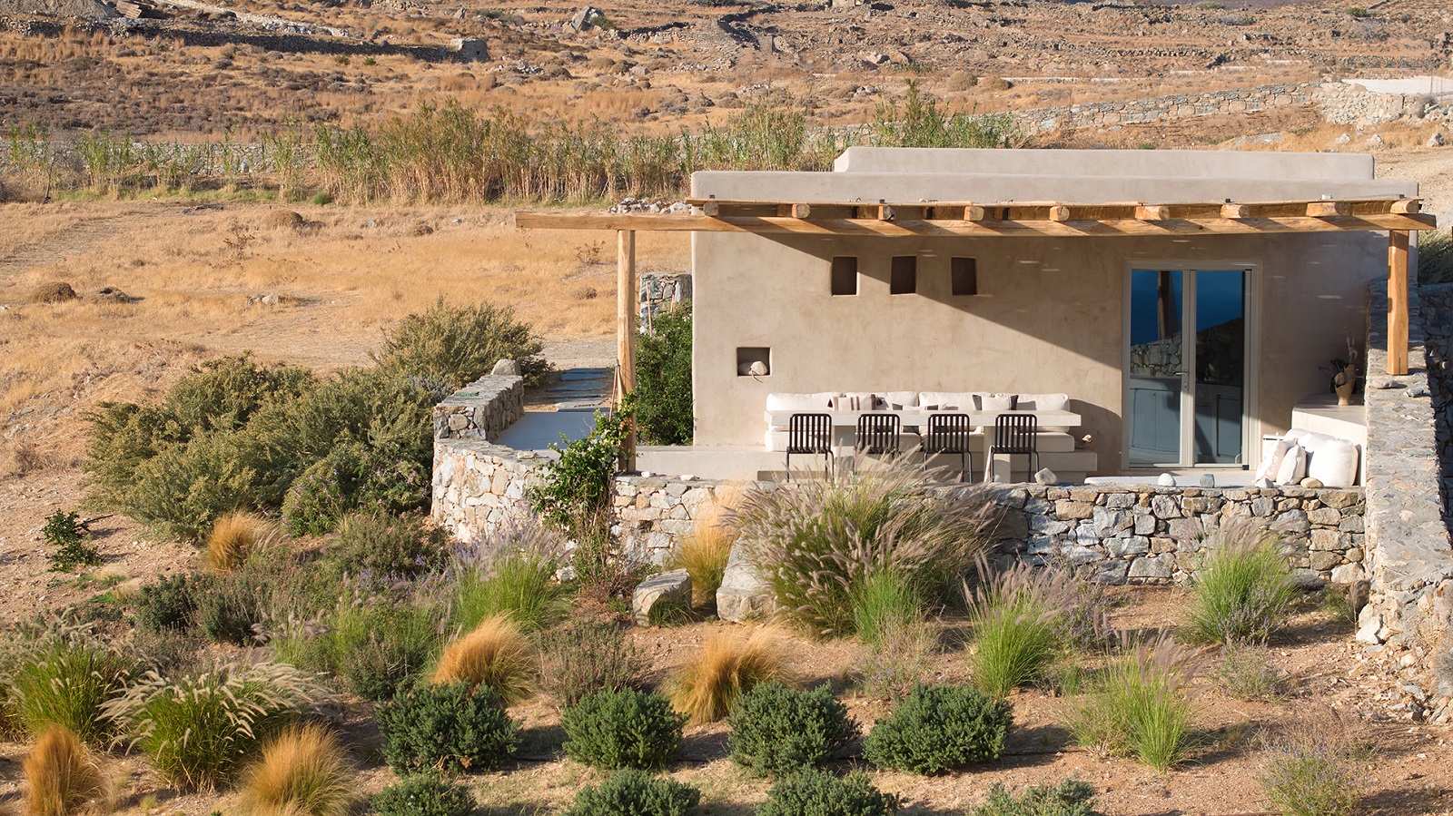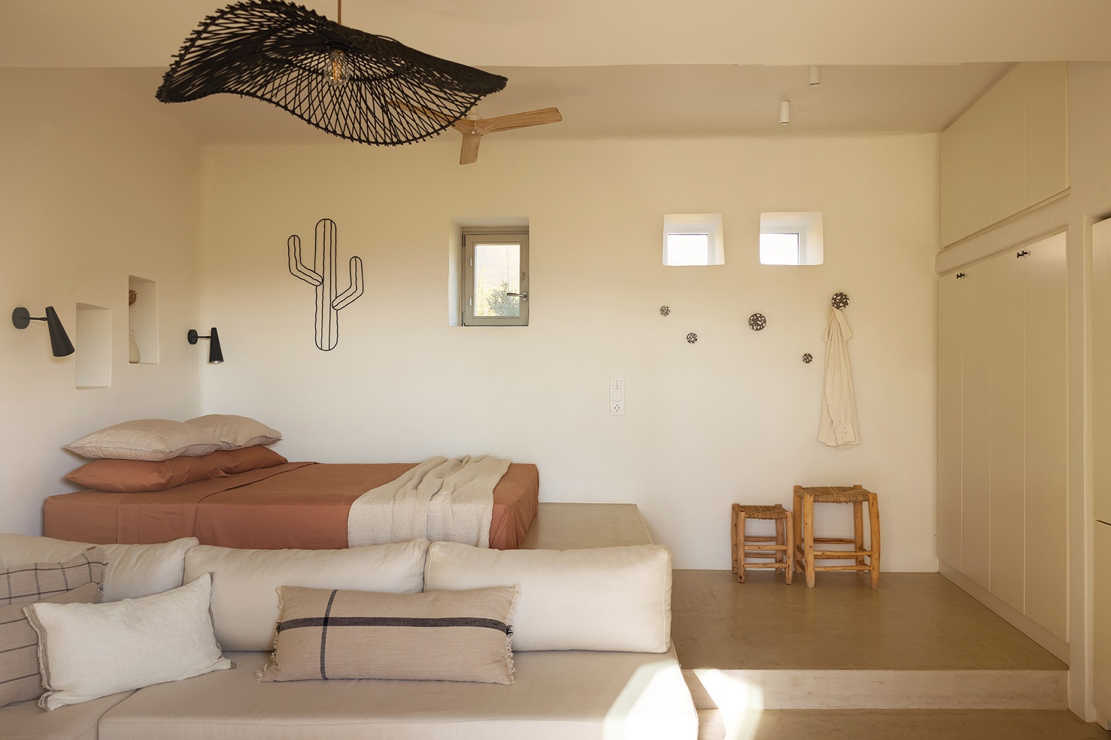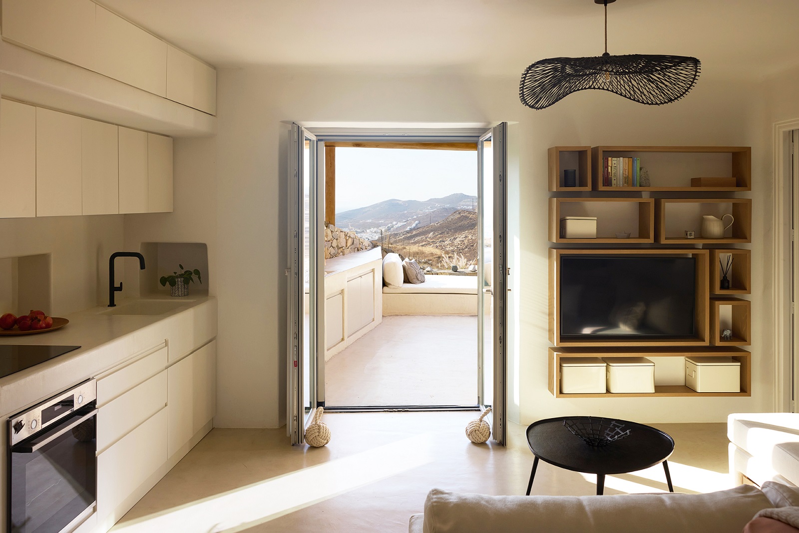 The outdoor courtyard, protected from the Cycladic winds, was designed as a space for relaxation and enjoyment of the view. It includes a large built-in dining area with a built-in sofa, an outdoor kitchen, and a daybed oriented toward the view of Chora. Shading is provided by a pergola made of natural chestnut wood and reed, creating a cool and inviting atmosphere, ideal for outdoor living.
