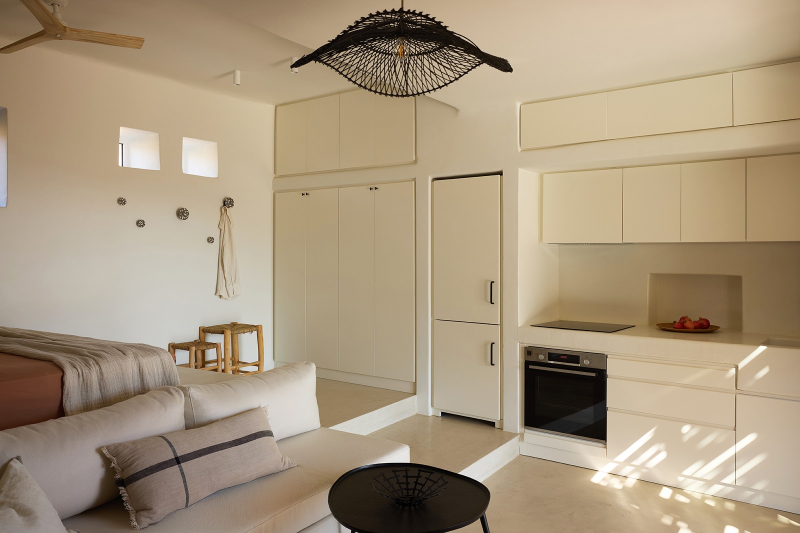 English description: The Keli 36 project, designed by architectural firm C-O lab, involves the reconstruction of two traditional cottages-cells (cell from the word keli in Greek) built before 1955, which were unified to create a small residence while preserving their distinct character and historical essence. The architectural approach maintained the difference in levels, both in the roofs and the interior floors, emphasizing the original scale and identity of the two separate structures despite their internal connection.