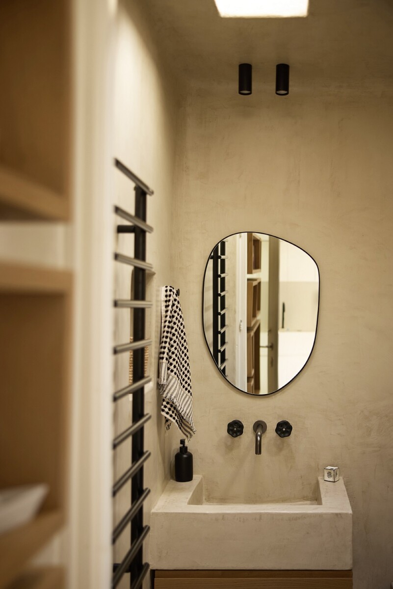 Most furniture is built-in, minimizing the presence of movable items. Carefully designed wall niches offer practical storage solutions, making the most of the limited space. In the bathroom, three small skylights allow ample natural light to flood the space, enhancing both its functionality and aesthetic appeal.