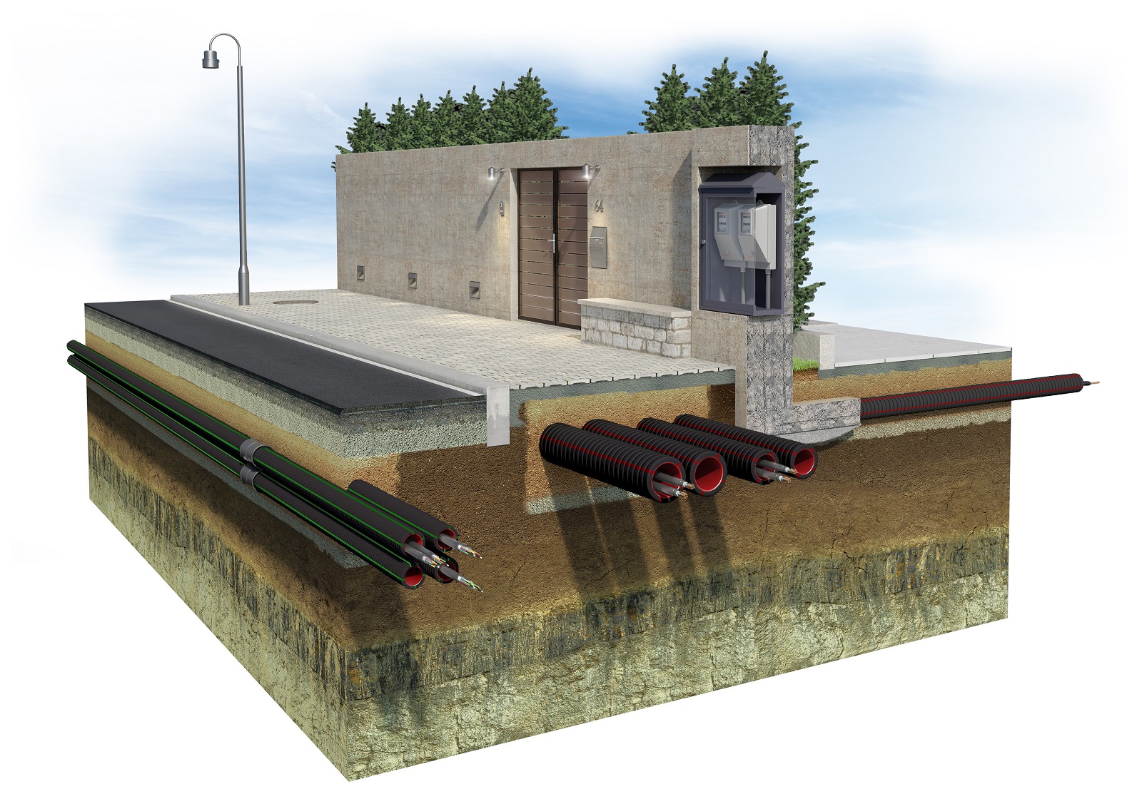 Υπόγειες εγκαταστάσεις με σωλήνες διπλού τοιχώματος GEONFLEX® – GEOSUB®. Εμφανής διαχωρισμός μεταξύ ισχυρών (κόκκινες γραμμές) και ασθενών (πράσινες γραμμές) ρευμάτων, Πηγή εικόνας: KOUVIDIS